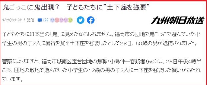 초등학생을 폭행하고 도게자를 강요한 혐의로 50대 남성이 체포됨.