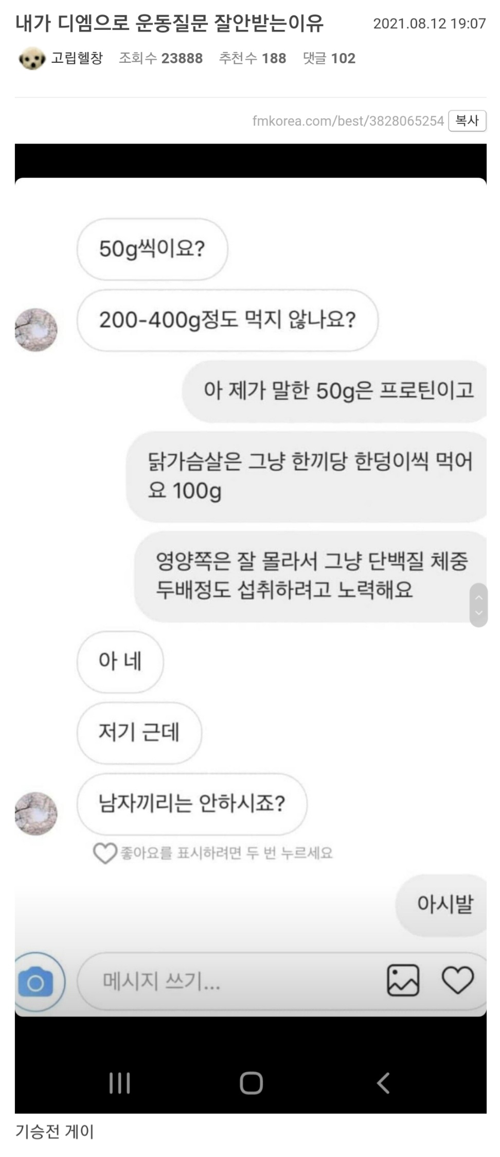디엠으로는 운동 질문 안받는다는 펨붕이 작성자안전한호구마|작성시간22.12.16|조회수5,384 목록 댓글 9 글자크기 작게가 글자크기 크게가 ㅊㅊ 펨코 다음검색 현재 게시글 추가 기능 열기 북마크 공유하기 신고 센터로 신고 댓글 댓글 9 댓글쓰기 답글쓰기 댓글 리스트 작성자핑크꼭지타릭 | 작성시간 22.12.16 ㅋㅋㅋㅋㅋㅋㅋㅋㅋㅋㅋ 삭제된 댓글입니다. 답댓글 작성자억새 | 작성시간 22.12.16 미친; 답댓글 작성자시각디자인 | 작성시간 22.12.16 억새 ㅈ같음; 작성자롬곡옾눞 | 작성시간 22.12.16 ㅋㅋㅋㅋㅋㅋㅋㅋㅋㅋㅋㅋㅋㅋㅋㅋㅋ존잘러 암흑편ㅋㅋㅋㅋㅋㅋㅋㅋㅋㅋ 댓글 전체보기