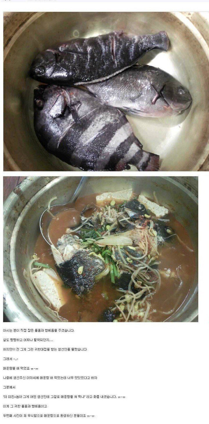 작성시간 23.01.03 돌돔 엄마도 자기자식이 매운탕될거라고는 생각못햇을듯 ㅋㅋ