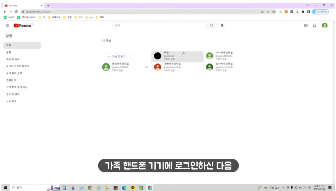 어머니핸드폰이면 어머니채널을, 아버지핸드폰이면 아버지채널을 눌러주시면 됩니다.
