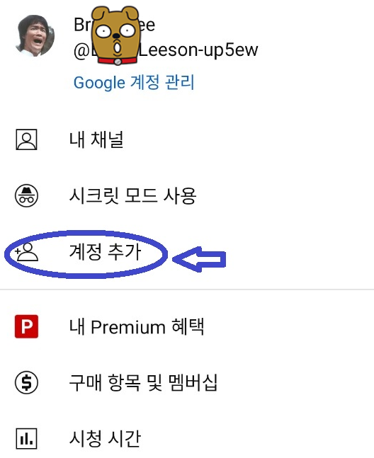 4. (중요) 부모님 핸드폰으로 유튜브 실행 - 오른쪽 상단 프로필 클릭 후 본인 구글계정추가