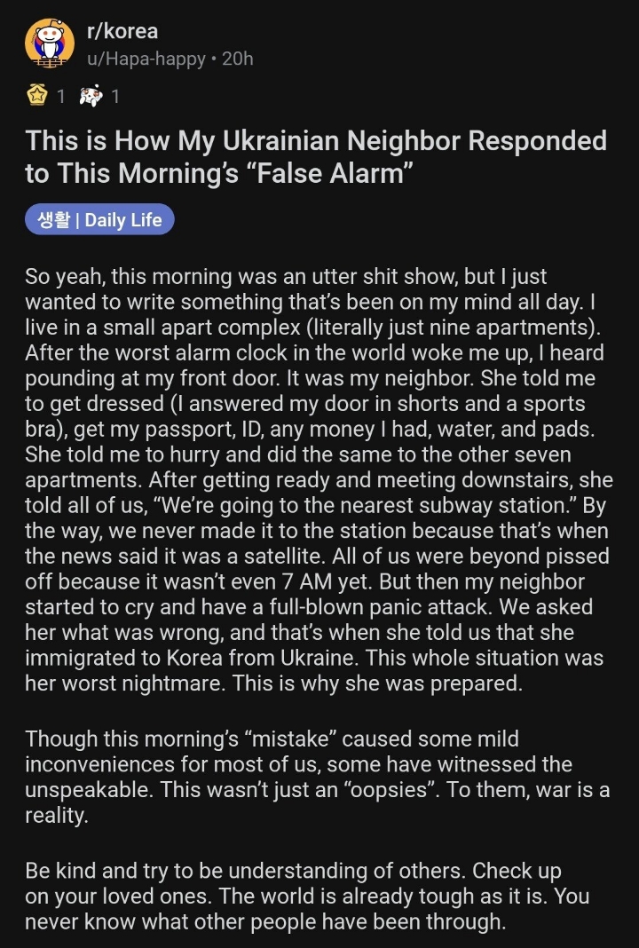 이 사람한텐 진짜 전쟁나는줄 알고 엄청 공포였을 듯...