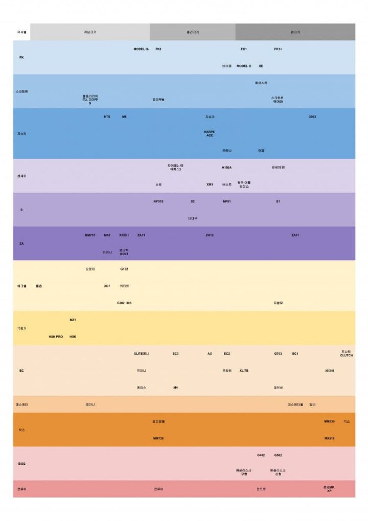 이 표는 세로축은 유사쉘, 가로축은 크기에따라 분류되어 있기 때문에 굳이 위의 성향에 따라 마우스를 선택하는 용도로 쓰지 않고 내 마음에 들만한 쉘을 찾는 용도로 써도 좋다.