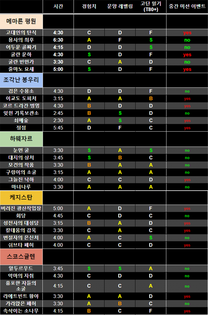 고단 밀기 : 80단 이상 기록 갱신에 쉬운 던전인지 아닌지. (던전별 고단 클리어 난이도)