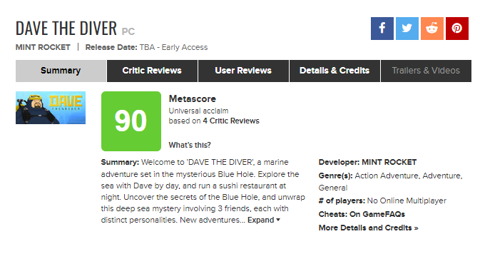 넥슨 신작 데이브 더 다이버 메타크리틱 등재 시작 작성자한꼬리|작성시간23.06.28|조회수6,262 목록 댓글 20 글자크기 작게가 글자크기 크게가 아직 비평은 4개뿐이지만 90점 시작 오늘(28일) 저녁 출시 예정 다음검색 현재 게시글 추가 기능 열기 북마크 공유하기 신고 센터로 신고 댓글 댓글 20 댓글쓰기 답글쓰기 댓글 리스트 작성자잉여의정점 | 작성시간 23.06.28 잘되라! 작성자Cocake | 작성시간 23.06.28 이거 뭐하는겜이에요? 답댓글 작성자전기쌍기사 | 작성시간 23.06.28 낮에는 잠수부로 로그라이크,rpg밤에는 잡은 물고기로 타이쿤 답댓글 작성자Cocake | 작성시간 23.06.28 전기쌍기사 작성자차를톡치면카톡 | 작성시간 23.06.28 오 퇴근하고 해봐야징 댓글 전체보기