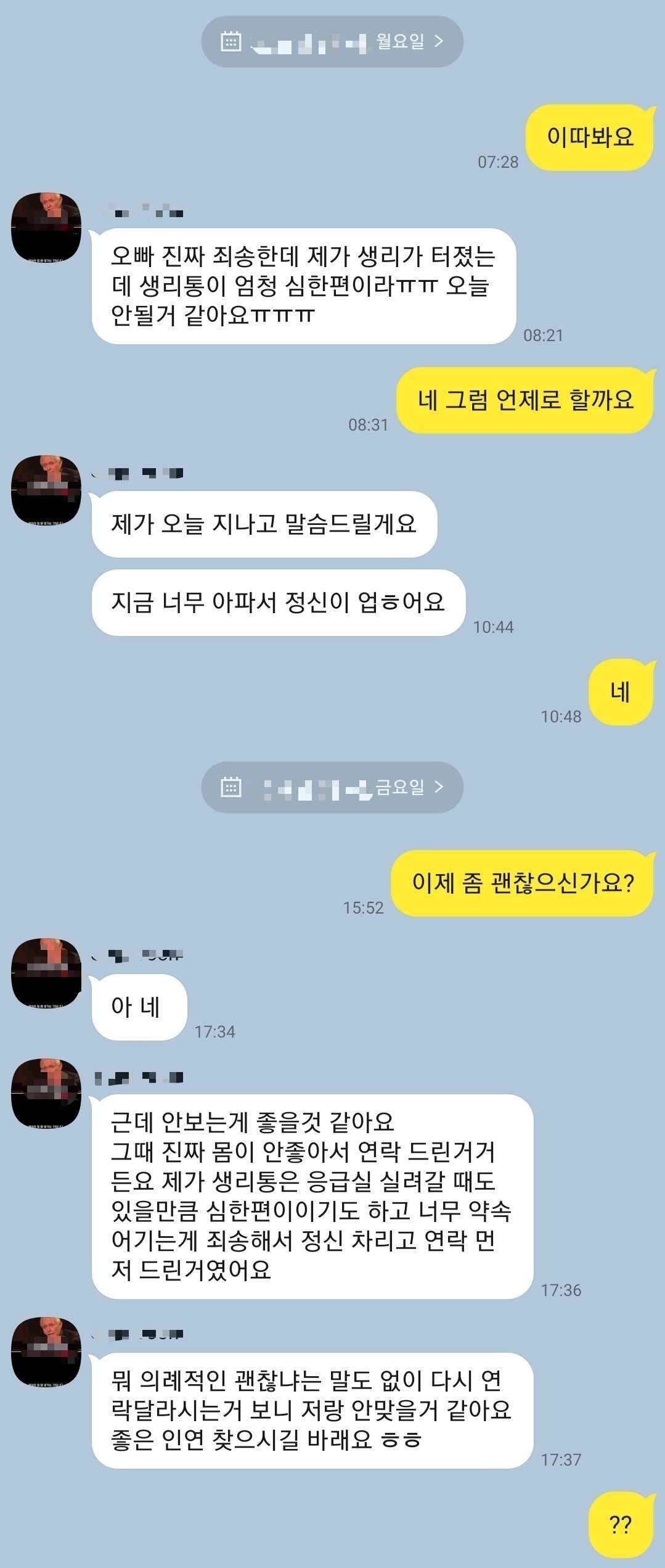 뭐 약속 당일에 파토내고 그런건 화날만 하지만, 생리라는건 사람마다 강도 차이가 워낙 크기 때문에 진찌 미친듯이 아플 수도 있는거고...