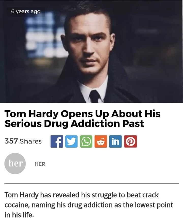 톰 하디는 데뷔 후에도 마약을 끊지 못했으나, 모종의 사건으로 마약은 물론 술도 완전히 끊었다고 합니다.