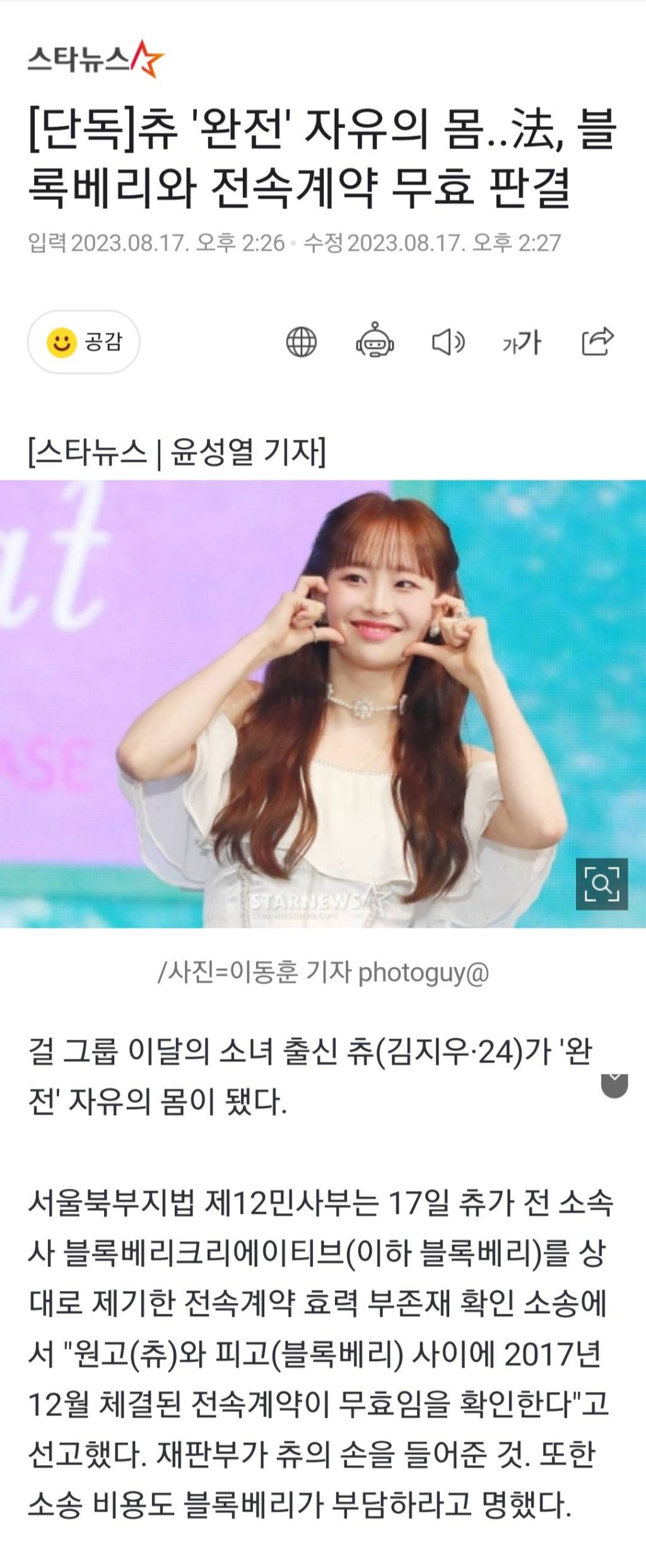 자유의몸이 된 츄 작성자스키테일러s|작성시간23.08.17|조회수3,837 목록 댓글 6 글자크기 작게가 글자크기 크게가 https://n.news.naver.com/entertain/article/108/0003175111[단독]츄 '완전' 자유의 몸..法, 블록베리와 전속계약 무효 판결걸 그룹 이달의 소녀 출신 츄(김지우·24)가 '완전' 자유의 몸이 됐다. 서울북부지법 제12민사부는 17일 츄가 전 소속사 블록베리크리에이티브(이하 블록베리)를 상대로 제기한 전속계약 효력 부존n.news.naver.com 다음검색 현재 게시글 추가 기능 열기 북마크 공유하기 신고 센터로 신고 댓글 댓글 6 댓글쓰기 답글쓰기 댓글 리스트 작성자Nowiknow | 작성시간 23.08.17 고생했네 ㅠㅠ 작성자갊낢닮 | 작성시간 23.08.17 어케 나오려나... 항소할거 같긴한데 블록베리 지저분하게 구는거 봐서는.... 작성자우주의섭리 | 작성시간 23.08.17 츄버지.. 작성자배고픈냥냥이 | 작성시간 23.08.17 ㅠㅠㅠ아거 작성자권 혁 | 작성시간 23.08.17 츄만? 나머지는 댓글 전체보기