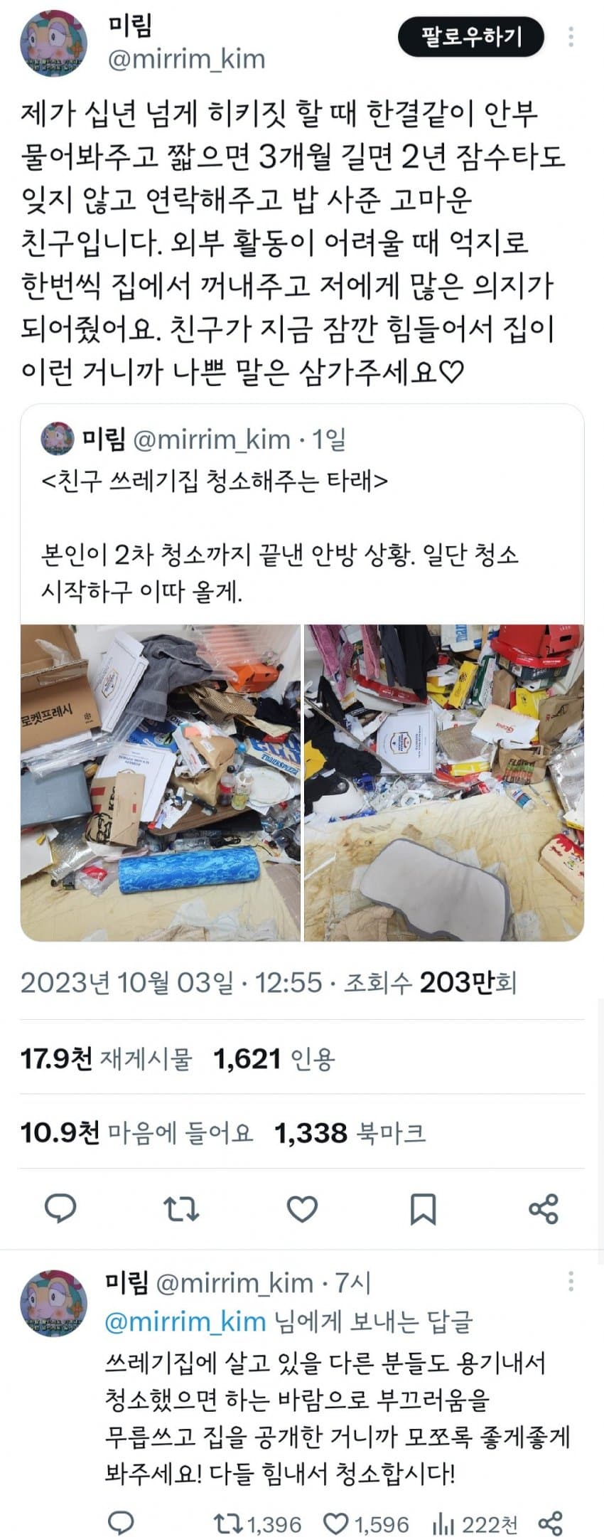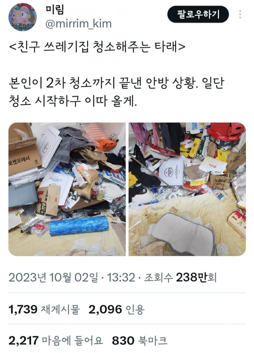 쓰레기집 청소해준 착한 친구 작성자내꿈은롯데우승보기|작성시간23.10.04|조회수29,464 목록 댓글 13 글자크기 작게가 글자크기 크게가 다음검색 현재 게시글 추가 기능 열기 북마크 공유하기 신고 센터로 신고 댓글 댓글 13 댓글쓰기 답글쓰기 댓글 리스트 작성자에디하우하우 | 작성시간 23.10.04 서로가 서로에게 쓸모가 되었다 작성자악성재고 | 작성시간 23.10.04 서로에게 의지가 되는 친구네요 작성자good4611 | 작성시간 23.10.04 와 멋지시네 서로 힘들 때 의지되는 친구 작성자faceless cancer | 작성시간 23.10.04 훈훈하네요 작성자고먐미 고양이 | 작성시간 23.10.04 저정도로 안치우는건 지금 병이 있는건데 정말 좋은 친구 두셨내 댓글 전체보기
