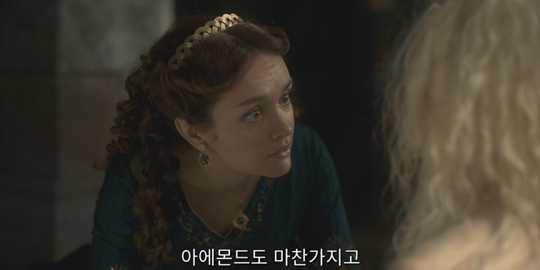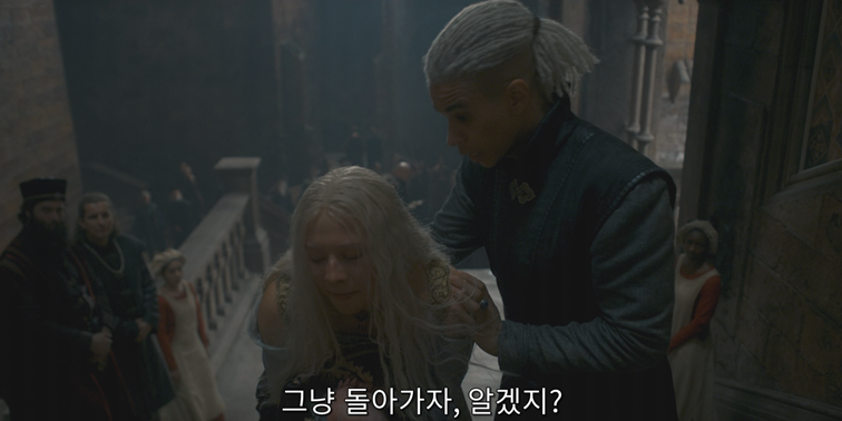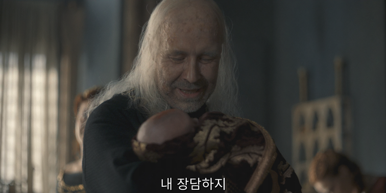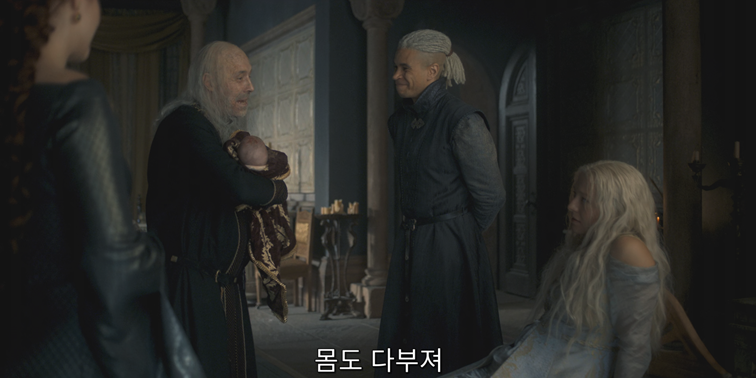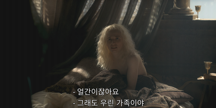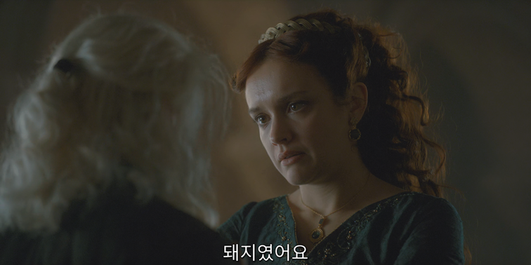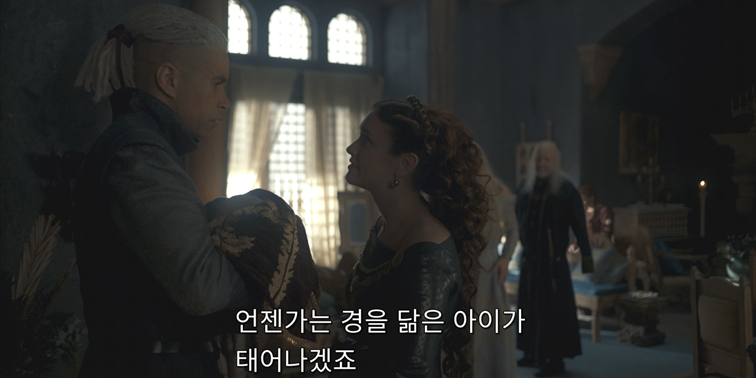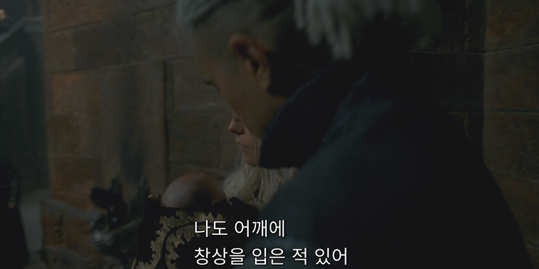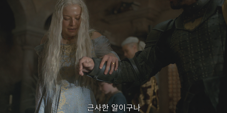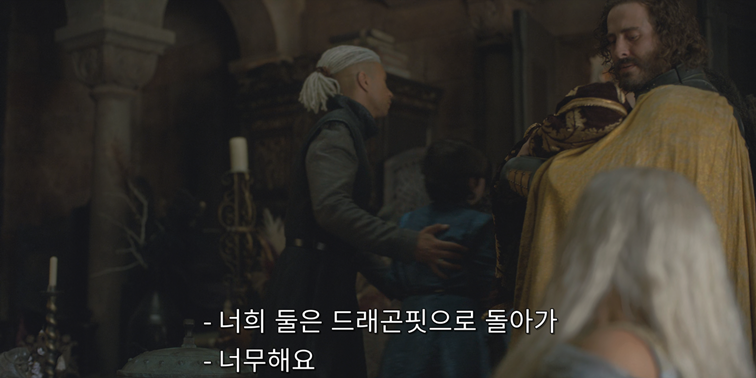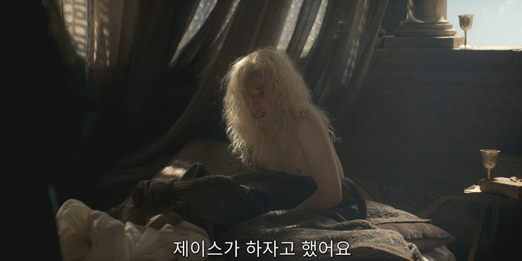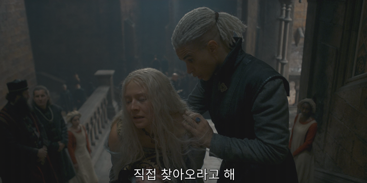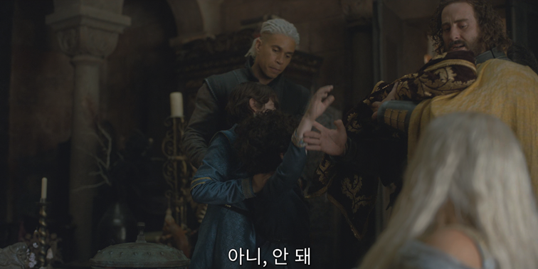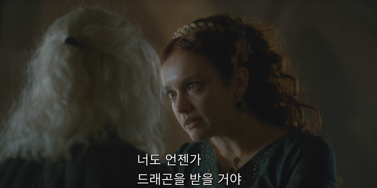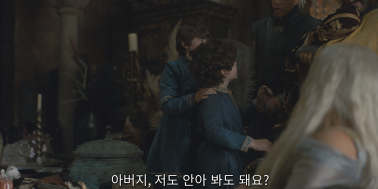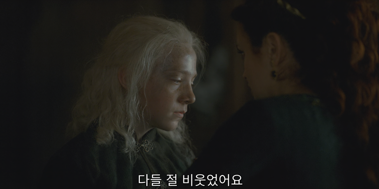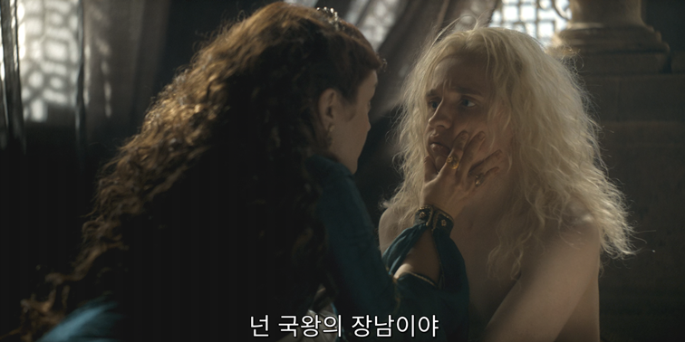 알리센트는 곧 자신의 행동이 과격했다는 걸 느꼈는지 아에곤의 머리를 어루만지는데요