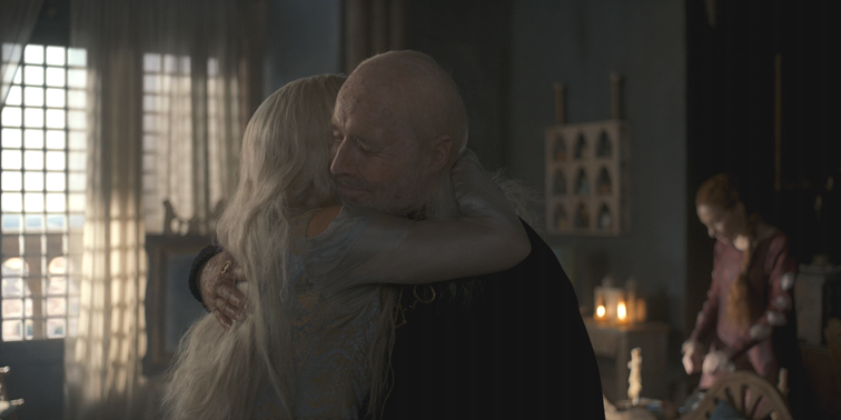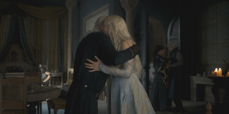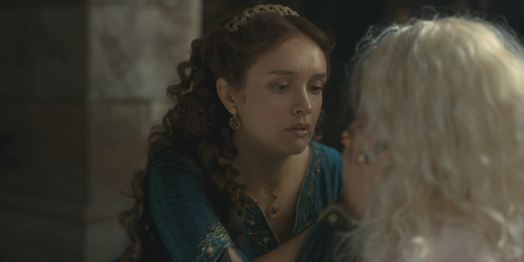 알리센트는 슬퍼하는 아들을 위로하며 따뜻하게 안아줍니다
