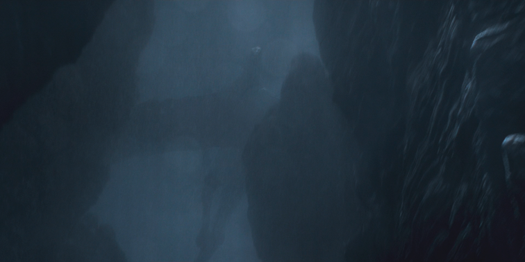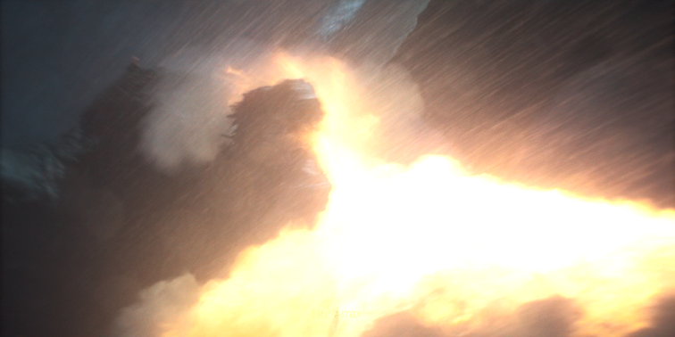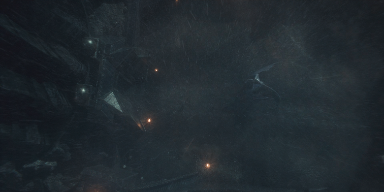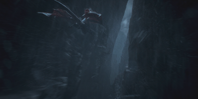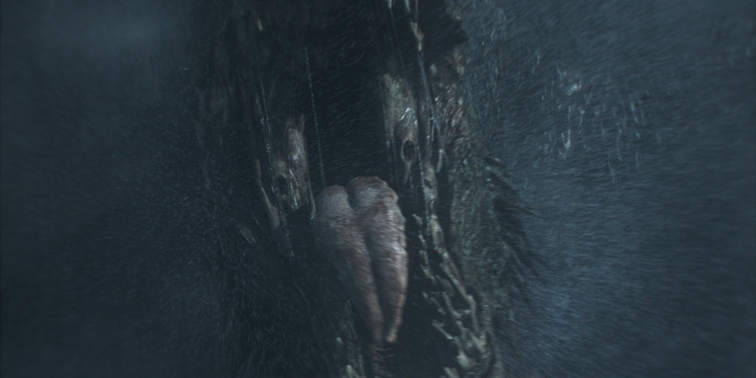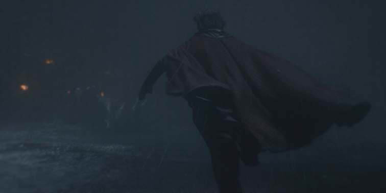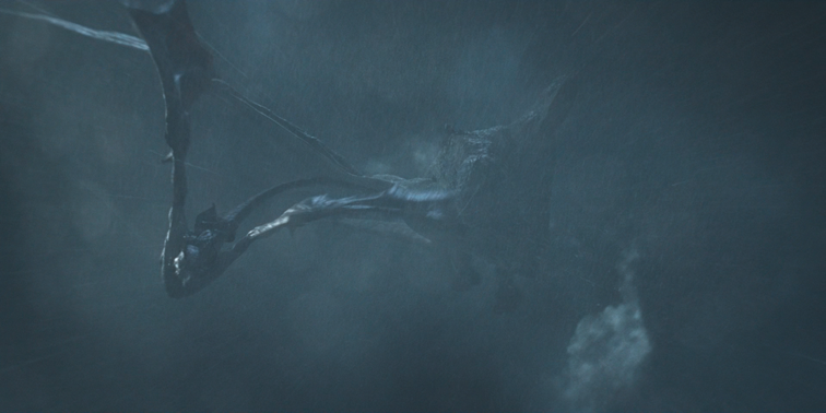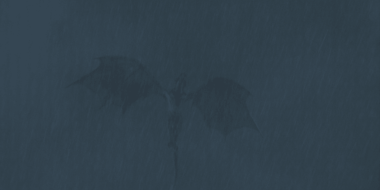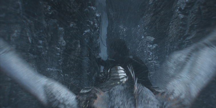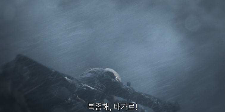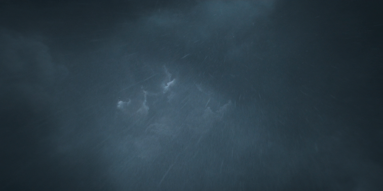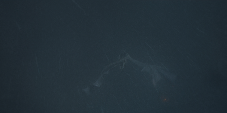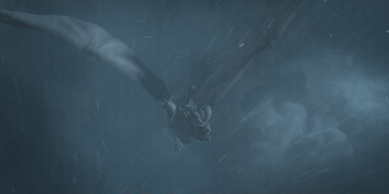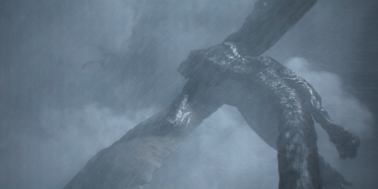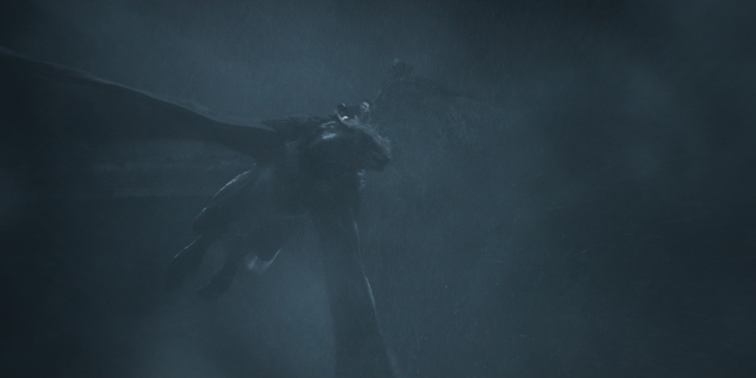 엄청난 비바람과 천둥 속을 가로지르는 거대한 형체가