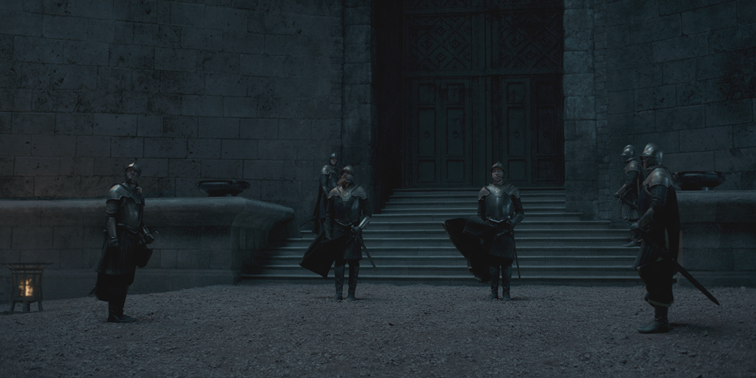 저편에 입구를 철벽처럼 지키고 있는 바라테온 가문의 병사들이 보입니다