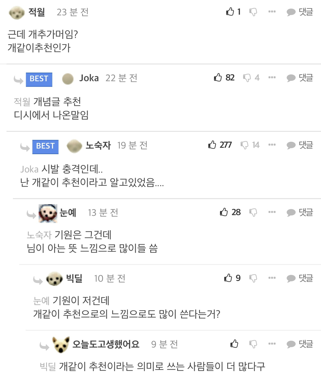 의외로 많이 모르는 개추 뜻. 작성자Ozma|작성시간23.11.07|조회수11,355 목록 댓글 38 글자크기 작게가 글자크기 크게가 개추 = 개념글 추천 줄임말. 다음검색 현재 게시글 추가 기능 열기 북마크 공유하기 신고 센터로 신고 댓글 댓글 38 댓글쓰기 답글쓰기 댓글 리스트 작성자뉴비 | 작성시간 23.11.07 ㅋㅋㅋㅋㅋ 전자든 후자든 뜻이 통하긴함ㅋㅋㅋㅋㅋ 개같이추천이라는 말이 먼가 더 디씨스러워서그렇지 작성자WINTER | 작성시간 23.11.07 개같이 추천 작성자믓시엘 | 작성시간 23.11.07 계추~ 작성자세상에나 이게뭐야 | 작성시간 23.11.07 헉 작성자파송송 | 작성시간 23.11.07 개추어 크래용 댓글 전체보기