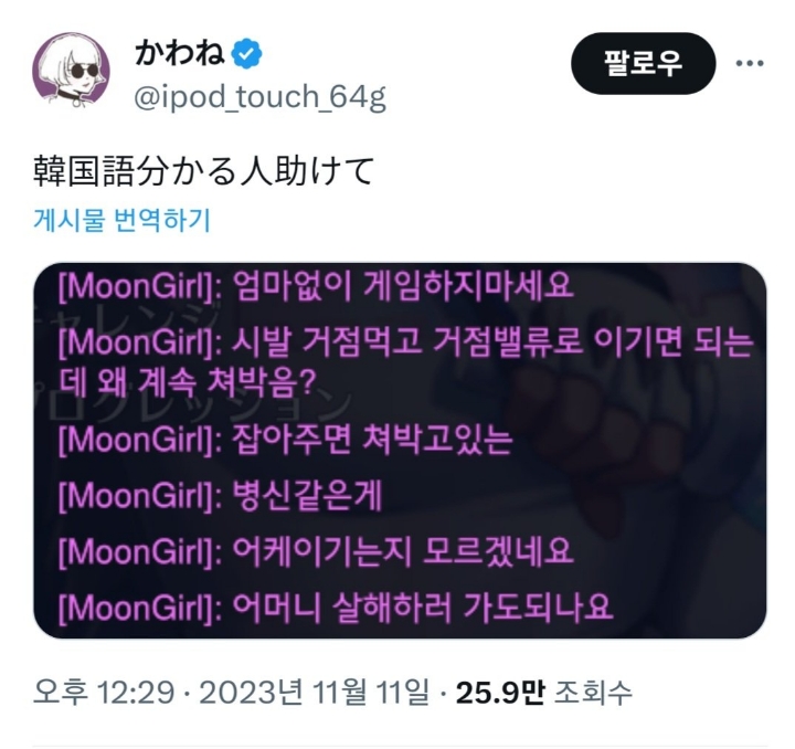 게임하다 한국인이 귓말로 저래 보냈는데 무슨뜻인지 물어본게 화제됨