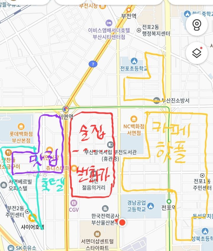 노란색 표시된 곳은 주로 전포카페거리라 부름