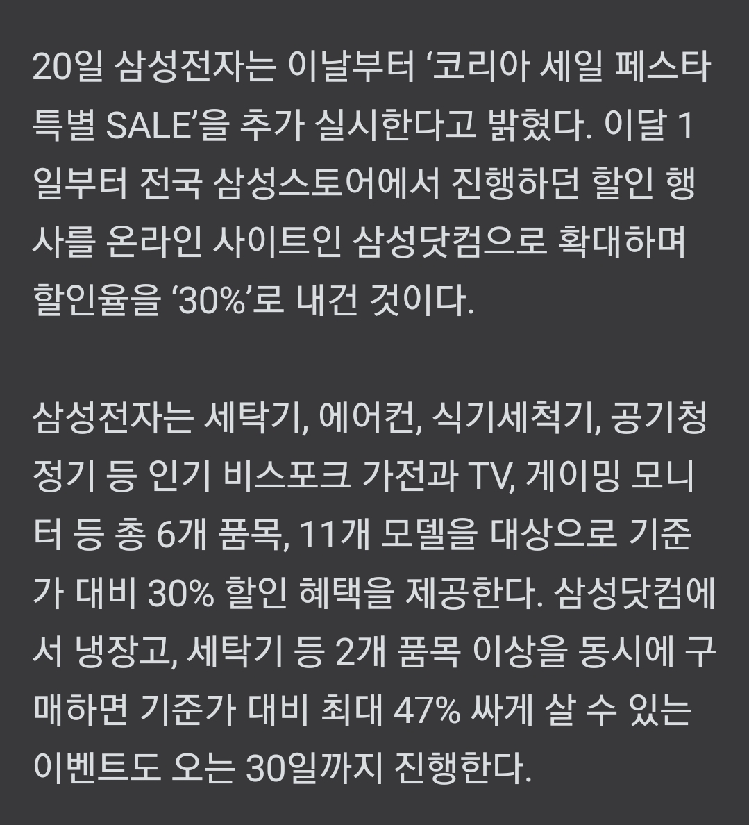 삼성전자 “가전 30% 할인” 왜?...야구 우승 LG 29% 세일에 ‘맞불’ 작성자siuuuuu|작성시간23.11.20|조회수29,474 목록 댓글 15 글자크기 작게가 글자크기 크게가 https://n.news.naver.com/mnews/article/023/0003800218?sid=105삼성전자 “가전 30% 할인” 왜?...야구 우승 LG 29% 세일에 ‘맞불’삼성전자가 일부 가전 제품에 대해 30% 할인 혜택을 제공한다. 지난 13일 1994년 이후 29년 만에 프로야구 한국시리즈 우승을 거머쥔 LG전자가 29% 할인 혜택을 예고한 데 따른 대응이다. 20일 삼성전n.news.naver.com 다음검색 현재 게시글 추가 기능 열기 북마크 공유하기 신고 센터로 신고 댓글 댓글 15 댓글쓰기 답글쓰기 댓글 리스트 작성자개발자때려치고싶음 | 작성시간 23.11.20 제발 삼성 좀 해줘... 작성자흔들어제껴 | 작성시간 23.11.20 삼성가전은 가격경쟁에서도 밀리면 엘지상대로 내세울게 하나도없아지기때문..... 작성자꾸르핵 | 작성시간 23.11.20 4연패할때도 할인했었나요? 작성자아이유13년차 | 작성시간 23.11.20 그 돈으로 야구 키울 생각은 안하고.. 작성자미소야2 | 작성시간 23.11.21 저번달에 결혼했는데.... 가전 2천. ㅠ 댓글 전체보기