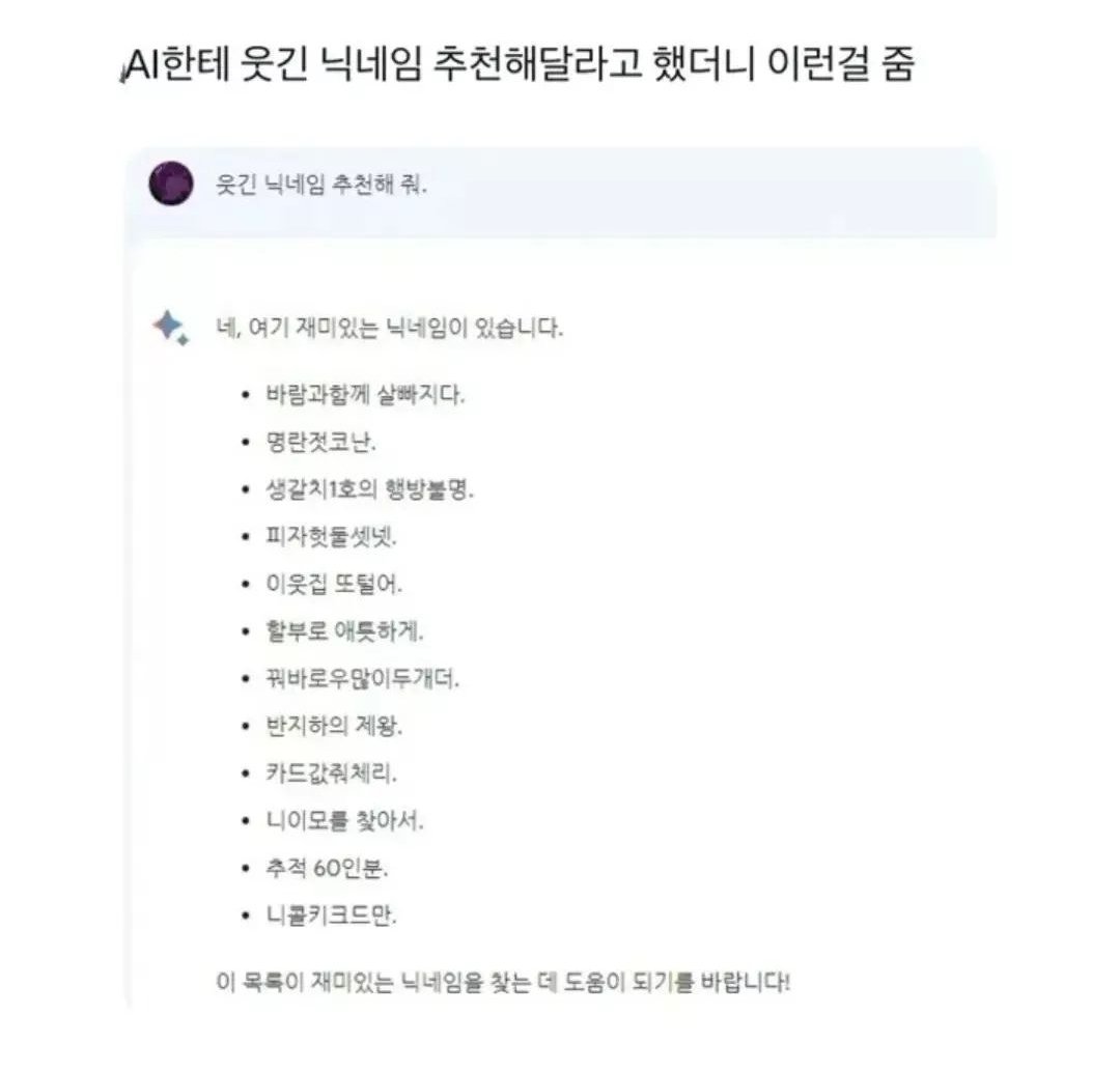AI한테 웃긴 닉네임 추천해달라고 했더니 작성자siuuuuu|작성시간23.11.23|조회수6,687 목록 댓글 39 글자크기 작게가 글자크기 크게가 다음검색 현재 게시글 추가 기능 열기 북마크 공유하기 신고 센터로 신고 댓글 댓글 39 댓글쓰기 답글쓰기 댓글 리스트 작성자SoulDestructer | 작성시간 23.11.23 ㅋㅋㅋㅋㅋㅋㅋㅌㅋㅋㅌㅌㅌㅋ 잘치네 작성자바삭치즈식빵 | 작성시간 23.11.23 이건 그냥 인터넷 검색해서 보여주는거자나 ㅋㅋ 작성자우루룩 | 작성시간 23.11.23 할부로 애틋하겤ㅋㅋ 작성자얼음오리 | 작성시간 23.11.23 꿔바로우많이두개더 뭐 패러디 한거에요?? 작성자2000.10.30 | 작성시간 23.11.23 하 ㅅㅂㅋㅋㅋㅋㅋㅋㅋㅋㅋㅋㅋㅋㅋ 댓글 전체보기