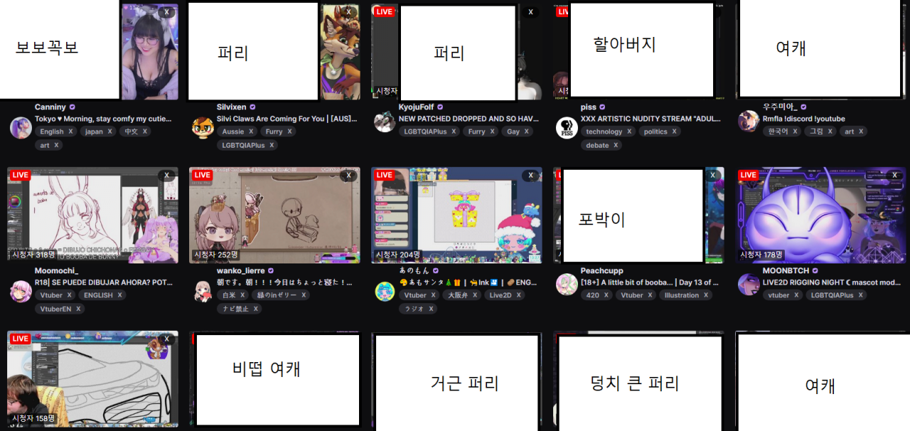 노출 규정 바뀐 트위치 아트 카테고리 근황.jpg 작성자카레맛짜장|작성시간23.12.14|조회수10,376 목록 댓글 34 글자크기 작게가 글자크기 크게가 쉽지 않음 아트 카테고리말고 저스트 채팅도배경 수위 체크한다고 올 노출인거 그냥 올려두는 사람들 생기는 중 다음검색 현재 게시글 추가 기능 열기 북마크 공유하기 신고 센터로 신고 댓글 댓글 34 댓글쓰기 답글쓰기 댓글 리스트 작성자LimeKaiN | 작성시간 23.12.14 어차피 섭종하는거 유해사이트로 막히는거 나쁘지않다 작성자말로함 | 작성시간 23.12.14 ㄷㄱ 작성자블랙호두마루 | 작성시간 23.12.14 아니ㅋㅋ트위치가니까 올노출 그림 떡하니 있네ㅋㄱㅋ 작성자Dododu. | 작성시간 23.12.14 혼돈의 카오스 작성자세상에나 이게뭐야 | 작성시간 23.12.14 ㅁㅊ 가보니까 미쳤네 ㅋㅋㅋ 댓글 전체보기