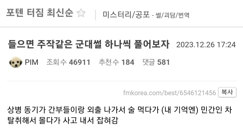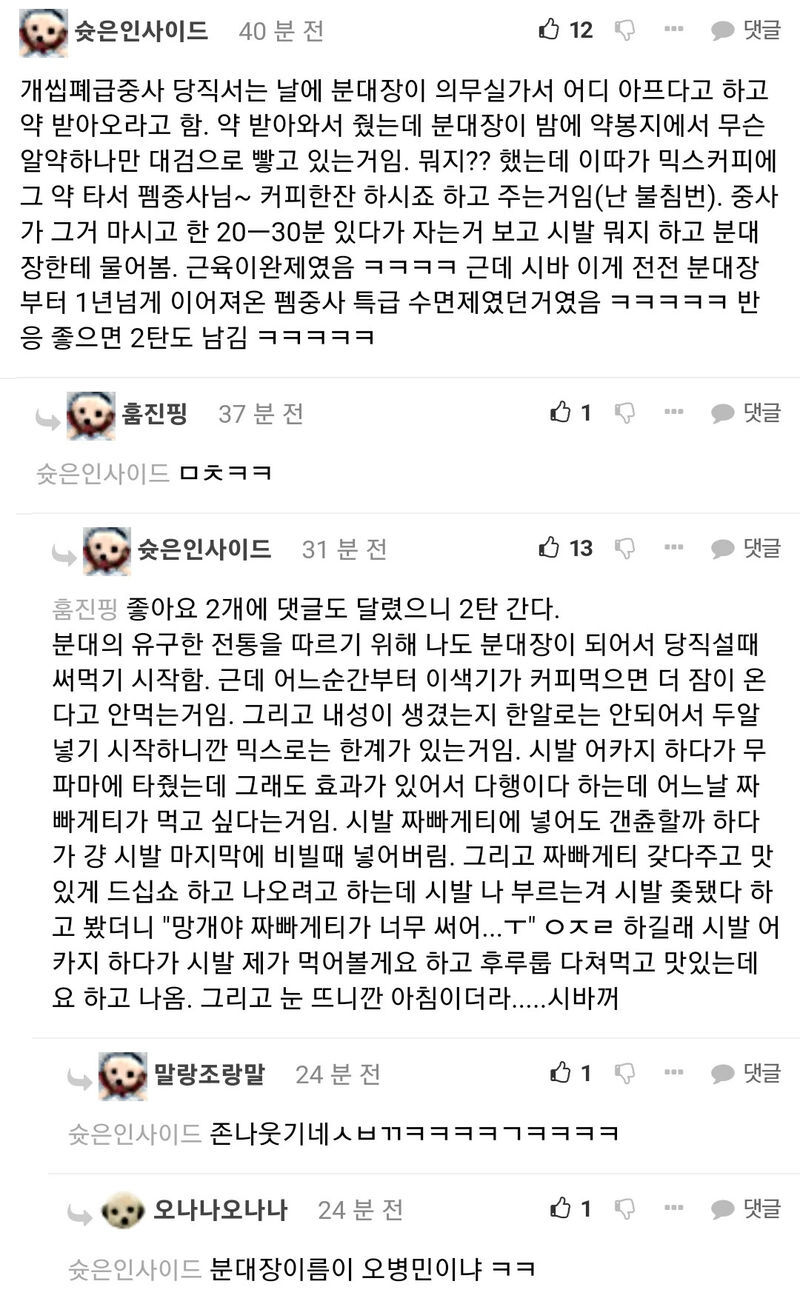 작성자나쁜생각 후 숨참기 5분 작성시간 23.12.27 11군번 논산훈련소에서 훈련받다가 1주차 탈영 > 잡힘 > 그대로 훈련(?)