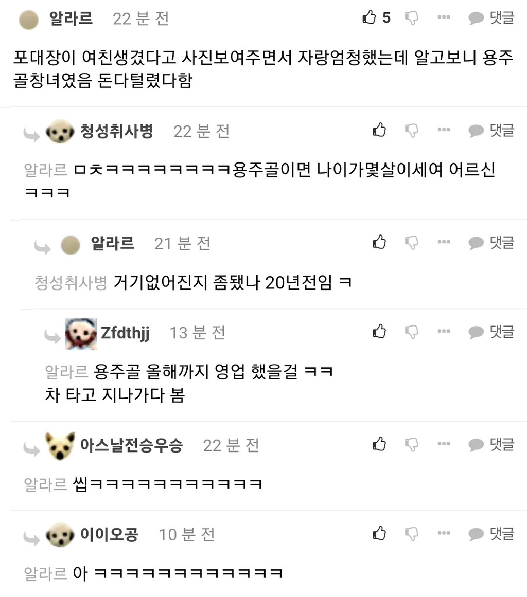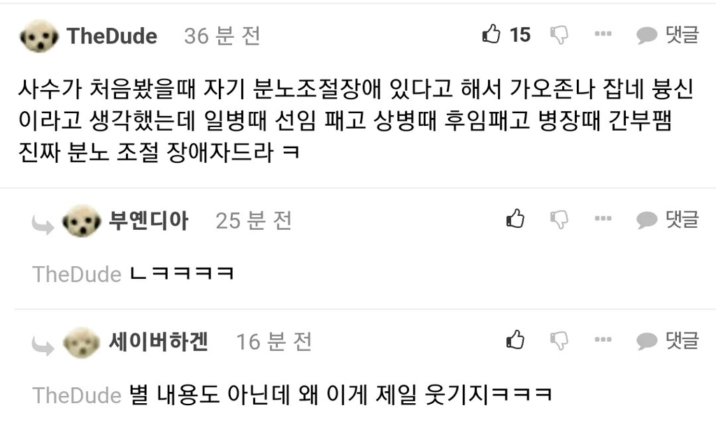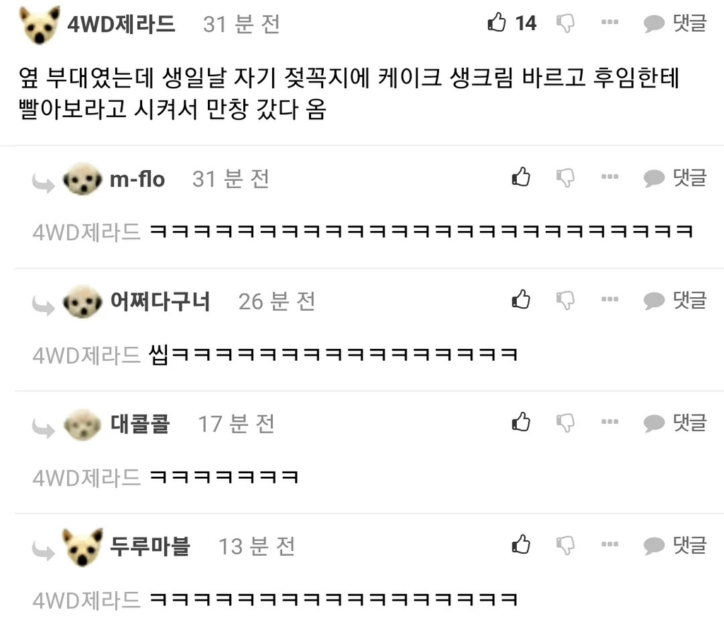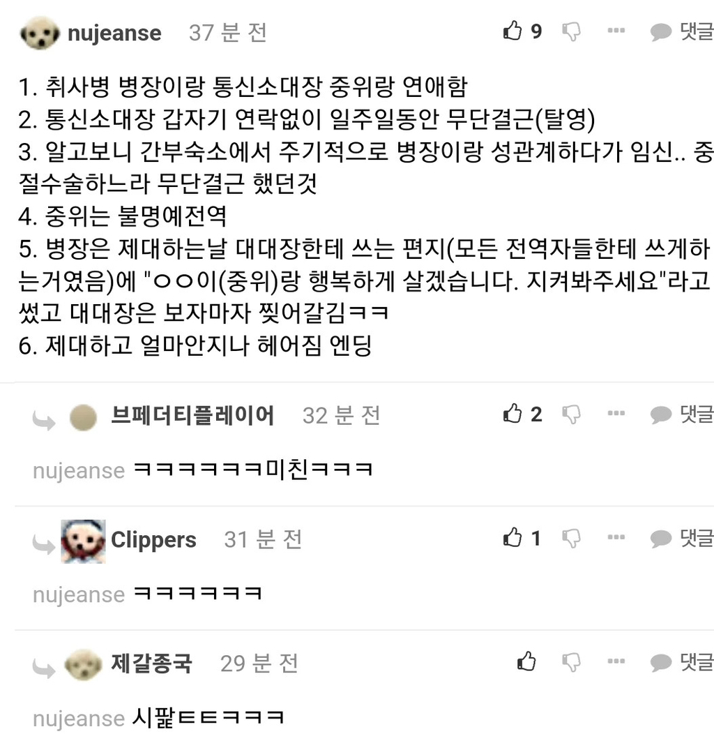 작성자물과같은존재 작성시간 23.12.27 같은중대 1달 선임인데 실상 15일 선임? 같지도않게 나한테 선임행세하다가 지 선임들오면 무서워하고 자살 행위도 2번정도하고 손목도 긋고 그랬음 근데 전역할때까지 관심병사로 지내다가 잘 전역은 함