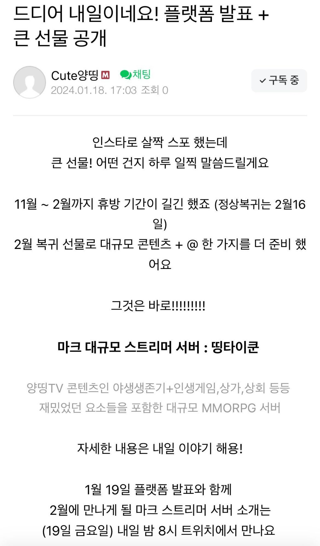 양띵 2월 복귀 선물로 대규모 스트리머서버 개설!!! 작성자일반조커|작성시간24.01.18|조회수7,404 목록 댓글 42 글자크기 작게가 글자크기 크게가 다음검색 현재 게시글 추가 기능 열기 북마크 공유하기 신고 센터로 신고 댓글 댓글 42 댓글쓰기 답글쓰기 댓글 리스트 작성자죽창 | 작성시간 24.01.18 마크는 판만 깔아주는거라 생각 작성자매뱅 | 작성시간 24.01.18 넹 치지직마세요 작성자하쓰늘소 | 작성시간 24.01.18 마크 초반만 재밌고 갈수록 노잼인데 스트리머 다같이 모이는거라 논란도 섭 열릴때마다 있던데 작성자규시 | 작성시간 24.01.18 넹 작성자살구맛살구 | 작성시간 24.01.18 잼잼마을처럼 잔잔한거면 진짜좋겠따 악놀같은 컨텐츠는 남놀때하고ㅋㅋㅋ 댓글 전체보기
