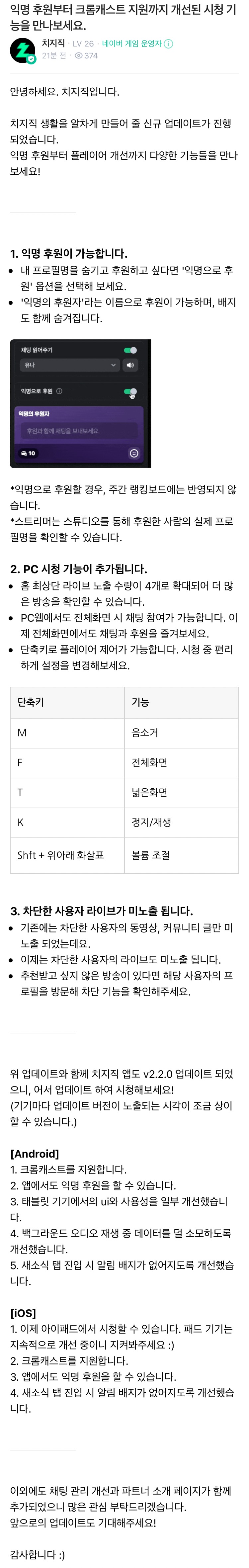 [치지직 업뎃] 익명 후원부터 크롬캐스트 지원까지 개선된 시청 기능을 만나보세요. 작성자칸나칸나가 와써|작성시간24.01.25|조회수2,634 목록 댓글 12 글자크기 작게가 글자크기 크게가 진짜 개발자들 갈고 있나ㅋㅋㅋㅋㅋㅋhttps://m.game.naver.com/lounge/chzzk/board/detail/3485212익명 후원부터 크롬캐스트 지원까지 개선된 시청 기능을 만나보세요. : 치지직안녕하세요. 치지직입니다.m.game.naver.com 다음검색 현재 게시글 추가 기능 열기 북마크 공유하기 신고 센터로 신고 댓글 댓글 12 댓글쓰기 답글쓰기 댓글 리스트 작성자뜬겁새로 | 작성시간 24.01.25 보기싫은 스트리머 차단도있네 ㄷㄷ 작성자튜우울립 | 작성시간 24.01.25 테블릿 보면 계속 버퍼링걸리던데 작성자부산매콤주먹 | 작성시간 24.01.25 와 진짜 개빠르네 ㅋㅋㅋㅋㅋㅋㅋ 작성자치련 | 작성시간 24.01.25 팔로잉 채널 썸네일 보는건 아직 없나요? 작성자정석을풀자 | 작성시간 24.01.25 크롬캐스트앱이랑 스마트티비앱이랑 뭐가 다른거지빨리 티비앱좀... 댓글 전체보기