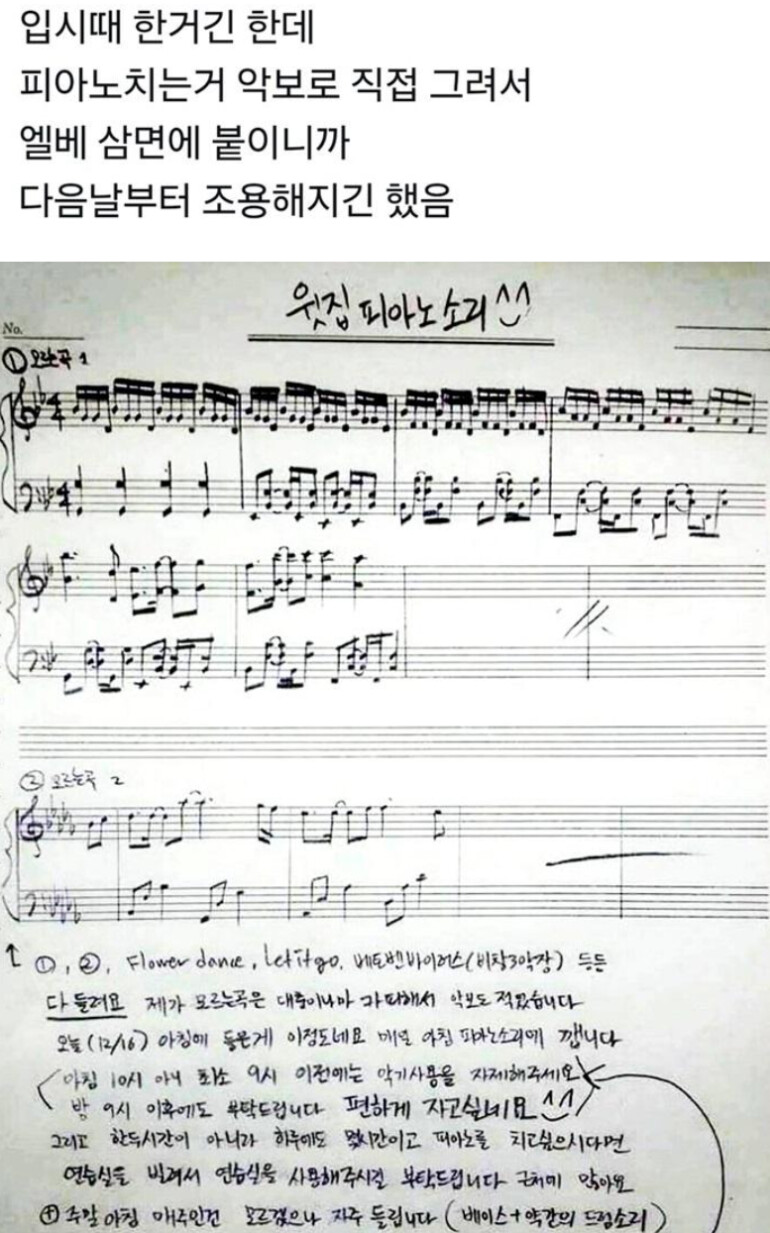 윗집 피아노 소리에 고통받던 사람이 붙인 경고문 작성자토니 스타크래프트|작성시간24.02.23|조회수17,666 목록 댓글 7 글자크기 작게가 글자크기 크게가 다음검색 현재 게시글 추가 기능 열기 북마크 공유하기 신고 센터로 신고 댓글 댓글 7 댓글쓰기 답글쓰기 댓글 리스트 작성자악장구 | 작성시간 24.02.23 와 ㅋㅋㅋㅋㅋㅋㅋㅋㅋㅋㅋㅋㅋㅋㅋㅋㅋㅋㅋㅋ 작성자잔맘보 | 작성시간 24.02.23 아랫곡 이거 아님?ㅋㅋㅋㅋhttps://youtu.be/lCrky7wNn-c?si=TWxdlzlhZtcFqb4X 동영상 삭제된 댓글입니다. 답댓글 작성자좌청년 우백수 | 작성시간 24.02.23 경고문 붙이는 게요? 답댓글 작성자차캅미다 | 작성시간 24.02.25 좌청년 우백수 사람들 들리게 피아노 치는것 댓글 전체보기