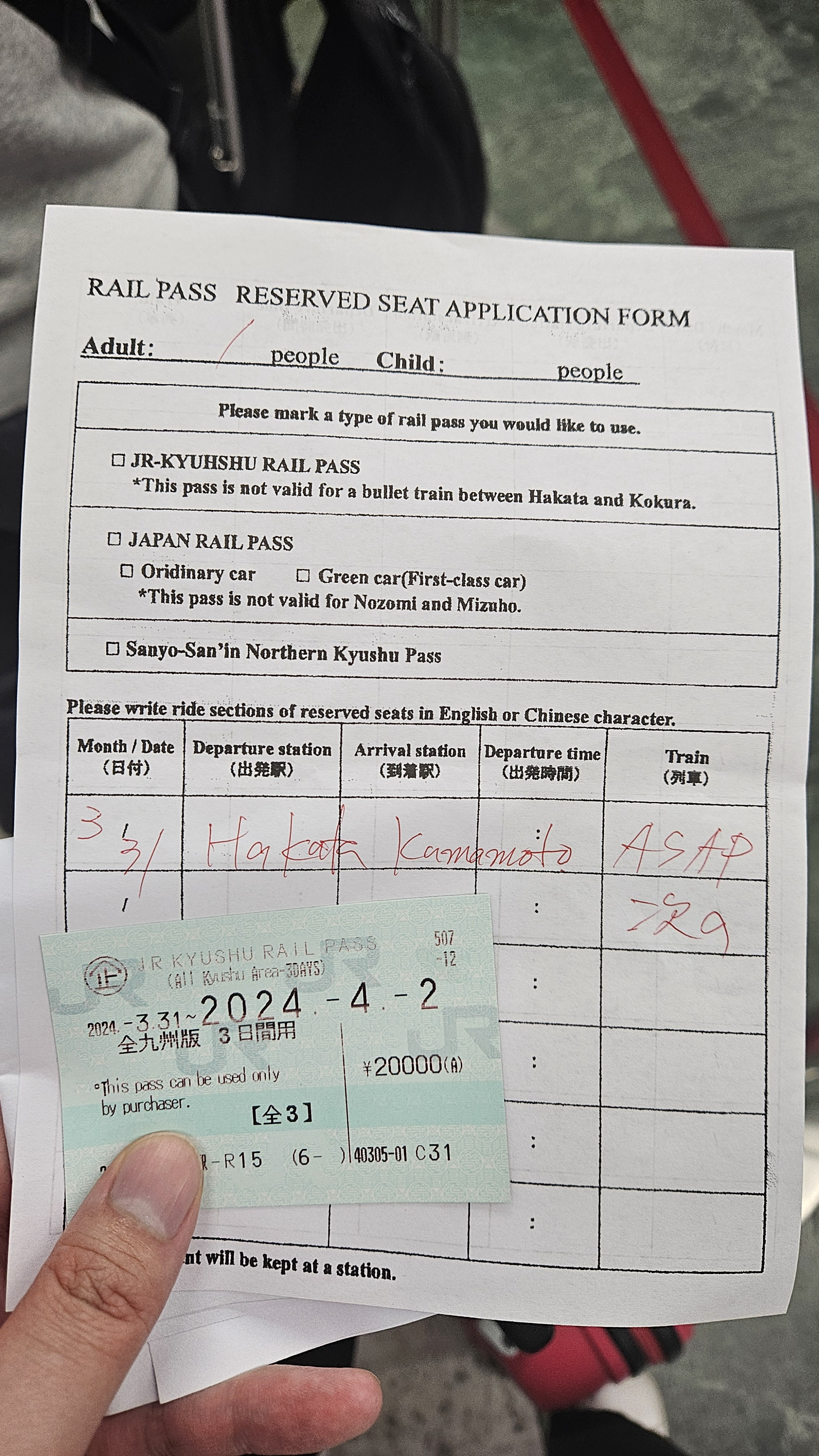 바로 옆에서 가장 빠른 구마모토행으로 예약
