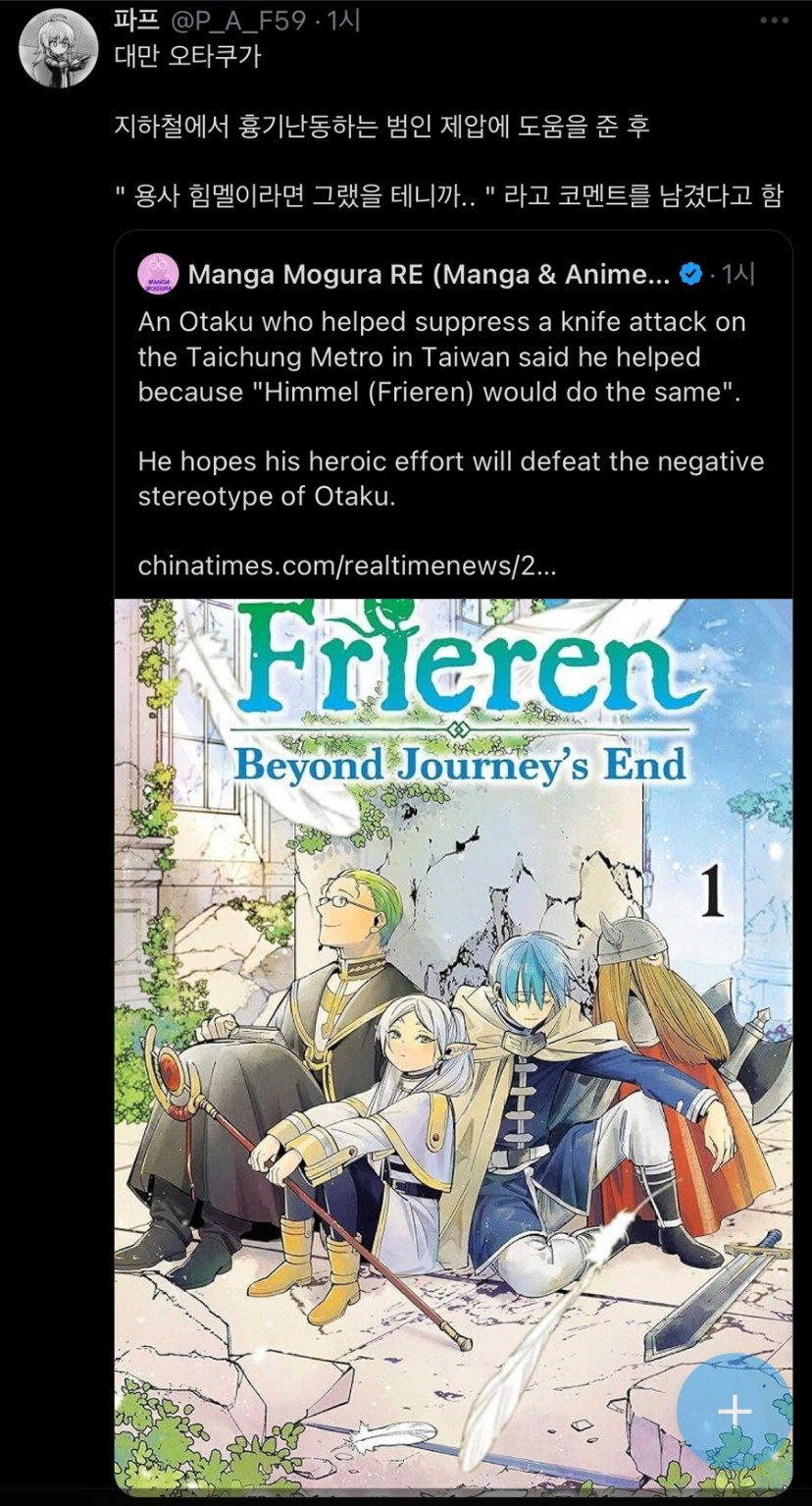 ??? : "용사라면 그랬을 테니까..." 작성자우주소녀보나t|작성시간24.06.05|조회수5,576 목록 댓글 28 글자크기 작게가 글자크기 크게가 대만에서 지하철에서 흉기로 난동중인 범인을 제압하다 얼굴에 칼로 피해까지 입은 사람의 말"힘멜도 분명 그렇게 할 거예요"생각보다 많이 다침;;어이! 오타쿠가 세상을 구한다...! 다음검색 현재 게시글 추가 기능 열기 북마크 공유하기 신고 센터로 신고 댓글 댓글 28 댓글쓰기 답글쓰기 댓글 리스트 작성자Overwerk | 작성시간 24.06.05 젠장 또 힘멜이야 작성자하피 | 작성시간 24.06.05 흉 안남았으면 좋겠다 ㅠㅠ 올곧은 사람이라는게 느껴짐 답댓글 작성자네이버로이전하자!! | 작성시간 24.06.06 어이, 이건 흉터가 아니야. 훈장이라고! 작성자모택똥 | 작성시간 24.06.05 눈 총명한거 보소 작성자desirable | 작성시간 24.06.05 ㅠㅜ 댓글 전체보기