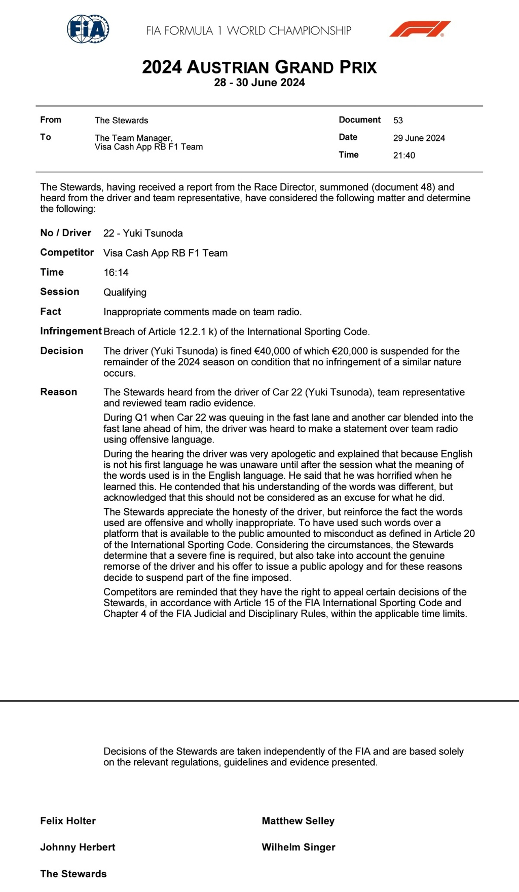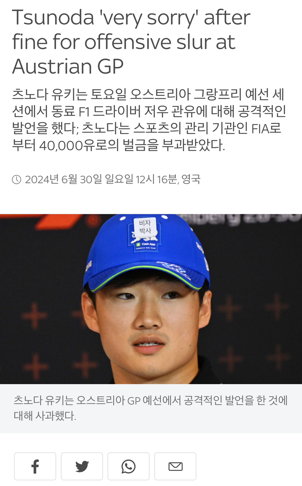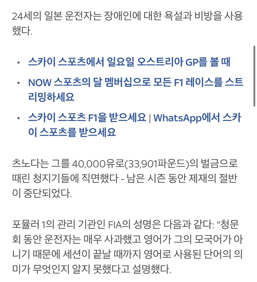 도탁스 (DOTAX) 지난 30일 욕설로 4만유로 벌금 받은 츠노다 유키 작성시간24.07.08|조회수7,530 목록 댓글 1 글자크기 작게가 글자크기 크게가 https://www.skysports.com/f1/news/12433/13161282/yuki-tsunoda-rb-driver-fined-for-using-offensive-slur-about-rival-during-austrian-gp-qualifying 다음검색 현재 게시글 추가 기능 열기 북마크 공유하기 신고 센터로 신고 댓글 1 댓글 리스트 작성시간 24.07.08 츠노다가 아무리 욕을 입에달고산다지만 저건 그냥 단어실수였던거겠죠?? 카페 방문해 더 많은 댓글 만나기!