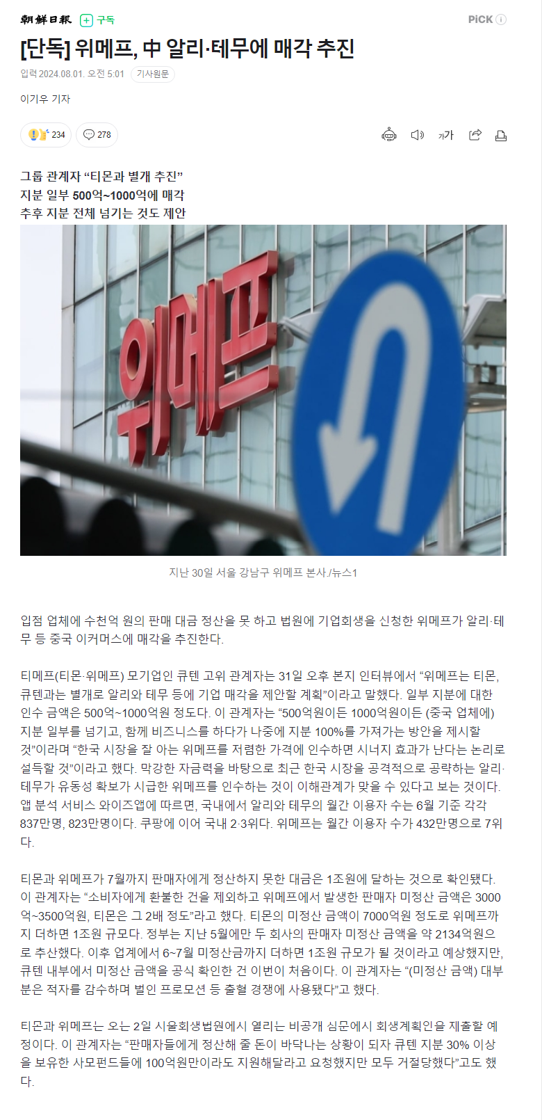 [단독] 위메프, 中 알리·테무에 매각 추진 작성자Robert Downey Jr.|작성시간24.08.01|조회수30,864 목록 댓글 13 글자크기 작게가 글자크기 크게가 다음검색 현재 게시글 추가 기능 열기 북마크 공유하기 신고 센터로 신고 댓글 댓글 13 댓글쓰기 답글쓰기 댓글 리스트 작성자야근없는회사생활 | 작성시간 24.08.01 위메프를 산다고…? 왜…? 답댓글 작성자zxoe | 작성시간 24.08.01 중국에선 지금 한국으로 넘어올 기회를 엿보고 있으니까 그럴듯요 작성자위소보 | 작성시간 24.08.01 그래 이렇게라도 해서 돈 해결할수 있으면 넘기자 작성자중립 | 작성시간 24.08.01 알리나 테무 배송 빨라지겠네 작성자Ben Shelton | 작성시간 24.08.01 ?? : 제가요? 댓글 전체보기
