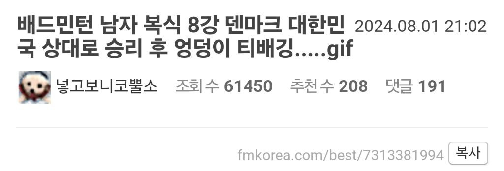 배드민턴 남자 복식 8강 덴마크 대한민국 상대로 승리 후 엉덩이 티배깅.....gif 작성자Wrestle_|작성시간24.08.01|조회수7,195 목록 댓글 15 글자크기 작게가 글자크기 크게가 다음검색 현재 게시글 추가 기능 열기 북마크 공유하기 신고 센터로 신고 댓글 댓글 15 댓글쓰기 답글쓰기 댓글 리스트 답댓글 작성자설원입니다 | 작성시간 24.08.01 상대가 더높음 답댓글 작성자하슬 | 작성시간 24.08.01 상대 2위 , 우리나라 4위에여 작성자아님말1고 | 작성시간 24.08.01 ㅋㅋㅋㅋㅋㅋㅋㅋ 작성자스문 | 작성시간 24.08.01 말왕보다못하네 작성자깔롱깔롱 | 작성시간 24.08.02 ㅋㅋㅋㅌㅌㅌㅌㅋㅋㅋㅋㅋ 댓글 전체보기