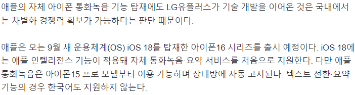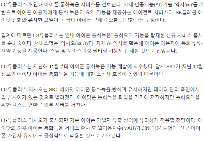 LG유플러스, 아이폰 통화녹음 서비스 '익시오' 내놓는다 작성자켄틸레버|작성시간24.08.02|조회수2,963 목록 댓글 7 글자크기 작게가 글자크기 크게가 https://n.news.naver.com/mnews/article/030/0003228764?sid=105LG유플러스, 아이폰 통화녹음 서비스 '익시오' 내놓는다LG유플러스가 연내 아이폰 통화녹음 서비스를 선보인다. 자체 인공지능(AI) 기술 '익시(ixi)'를 기반으로 아이폰 이용자에게 통화 녹음과 요약 기능을 제공하는 에이전트 서비스다. SK텔레콤 에이n.news.naver.com 다음검색 현재 게시글 추가 기능 열기 북마크 공유하기 신고 센터로 신고 댓글 댓글 7 댓글쓰기 답글쓰기 댓글 리스트 답댓글 작성자윤동희 | 작성시간 24.08.02 녹음하기전에 상대방한테 녹음하겠습니다라고 말해주고 녹음한데요... 답댓글 작성자Even Of Day | 작성시간 24.08.02 전자음 나옴.. 녹음 시작할때, 끝낼때.. 작성자Seoulite | 작성시간 24.08.02 빨리내줘 ㅅㅂ 작성자개굴사자 | 작성시간 24.08.02 우와아 빨리..!!! 작성자해쏘옹 | 작성시간 24.08.02 제발 알뜰폰듀 ㅠ 댓글 전체보기