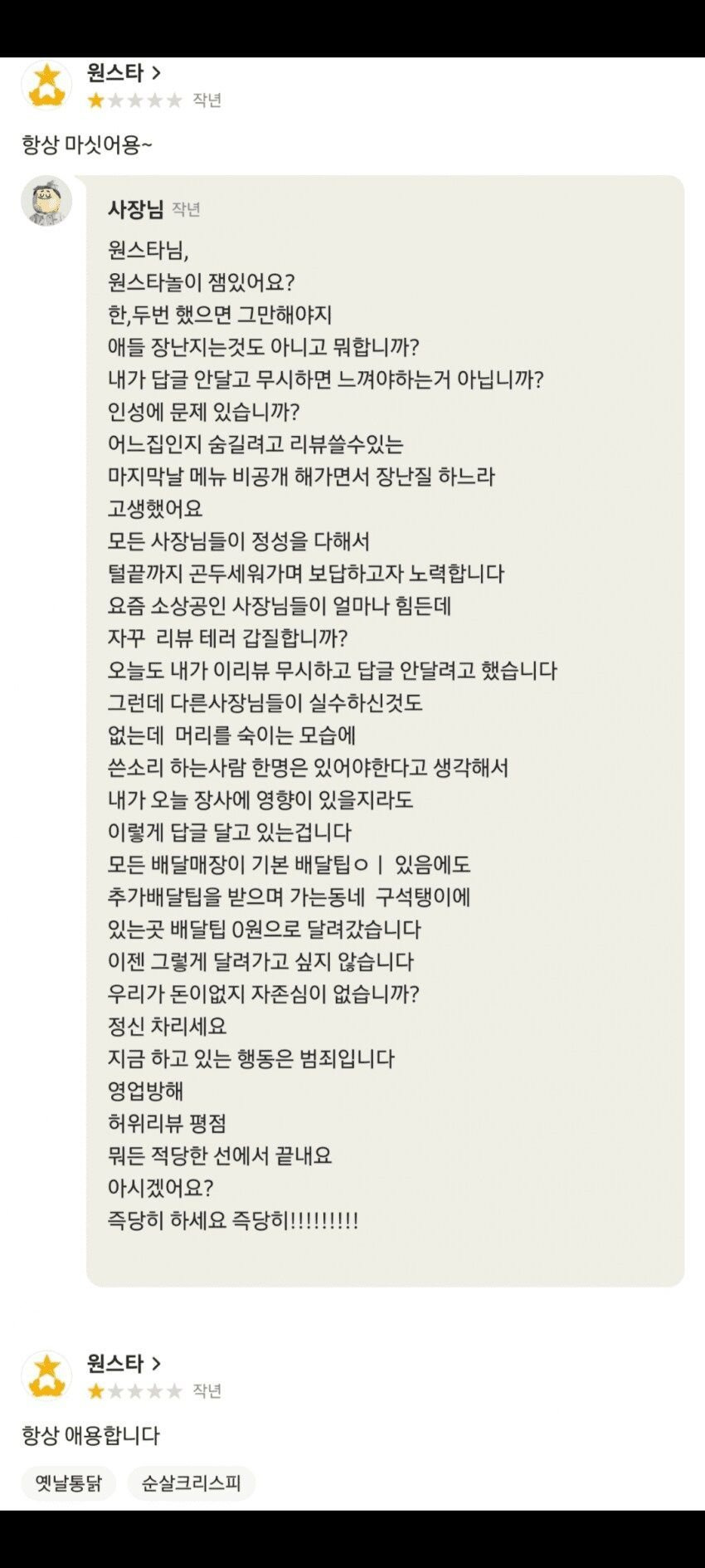 작성자Chat GPT4.0 작성시간 24.08.16 별점 테러 신고기능 없나요? 저렇게 대놓고 장난치는거는 배민에서 모니터링하고 충분히 걸러낼 수 있을 것 같은데...