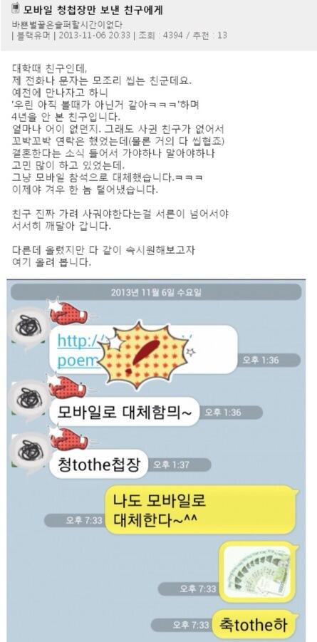 작성시간 24.09.06 인사도 없이 청첩장만 보낸사람 있었는데 결국 내친구들 아무도 안감ㅋㅋ