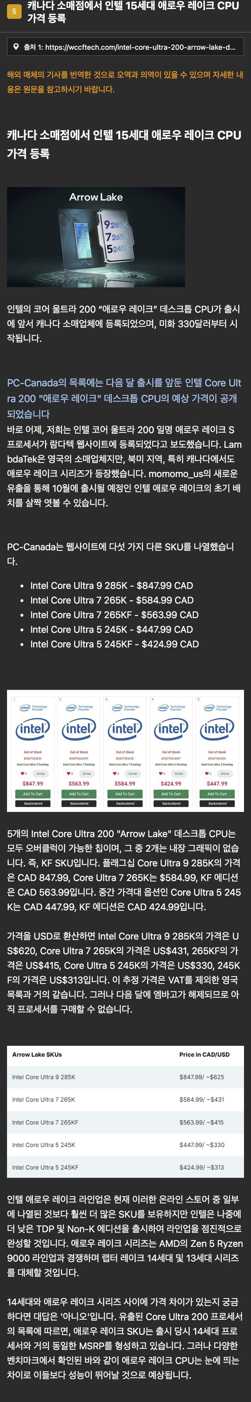 Intel core ultra 9 285k: 620달러(한화 83만원)