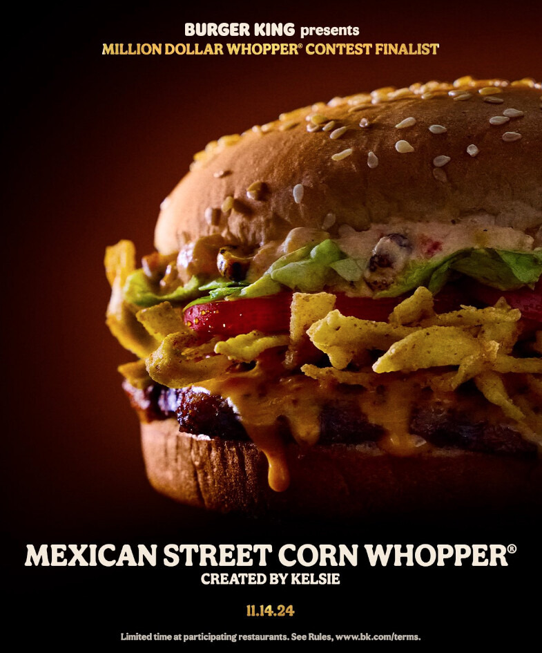 소고기 패티 베이스에 옥수수 스프레드, 토르티야 크리스프, 멕시칸 매콤한 퀘소가 특징