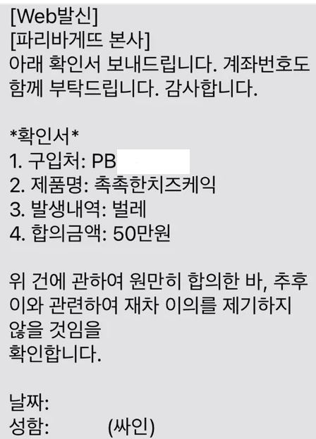 파리가 들어간 파리바게뜨빵 본사의 합의 조건.jpg 작성자영정무서웡|작성시간24.09.18|조회수79,309 목록 댓글 33 글자크기 작게가 글자크기 크게가 다음검색 현재 게시글 추가 기능 열기 북마크 공유하기 신고 센터로 신고 댓글 댓글 33 댓글쓰기 답글쓰기 댓글 리스트 작성자인천 | 작성시간 24.09.18 50 개 꿀;; 작성자번듯한 호랑이 | 작성시간 24.09.18 복권이네 작성자그냥살아ㅏ | 작성시간 24.09.18 파리 ! 봐! 게트 작성자민대풍 | 작성시간 24.09.18 먹은것도 아니고 쟤들도 실수로 들어간거고 빵만 바꿔주는것도 아니고 50만원 준다는건데 뭐 얼마나 받아내야 속이 시원한거임?????? 작성자RightUp | 작성시간 24.09.19 나도 벌레 줘요 댓글 전체보기