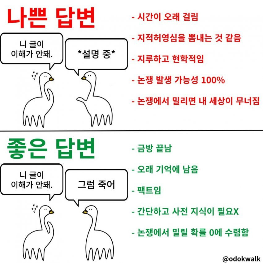 [[기타]]나쁜 답변 vs 좋은 답변.JPG 작성자이시연|작성시간24.10.04|조회수2,963 목록 댓글 5 글자크기 작게가 글자크기 크게가 다음검색 현재 게시글 추가 기능 열기 북마크 공유하기 신고 센터로 신고 댓글 댓글 5 댓글쓰기 답글쓰기 댓글 리스트 작성자백수 | 작성시간 24.10.04 이 글이 이해가 안돼요 답댓글 작성자누렁누렁이 | 작성시간 24.10.04 그럼 쥬거 답댓글 작성자선토까끼 | 작성시간 24.10.04 그럼 죽어 작성자Witch king | 작성시간 24.10.04 찐특) 팩트임 작성자이거왜이럿개댐 | 작성시간 24.10.04 이미지 확대 댓글 전체보기