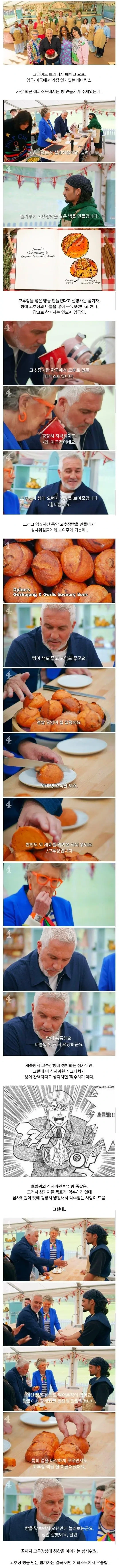 영국 베이킹쇼에서 고추장으로 빵을 만든 참가자 작성자가담항설|작성시간24.11.16|조회수2,992 목록 댓글 6 글자크기 작게가 글자크기 크게가 다음검색 현재 게시글 추가 기능 열기 북마크 공유하기 신고 센터로 신고 댓글 댓글 6 댓글쓰기 답글쓰기 댓글 리스트 작성자돈많은백수 | 작성시간 24.11.16 장떡같은 느낌인가 작성자디스펠도못쓰는놈 | 작성시간 24.11.16 진짜 짐작도 안가는 맛이네 궁금쓰 작성자버터 | 작성시간 24.11.16 먹어보고싶다ㅋㅋ 작성자가사를까먹었내 | 작성시간 24.11.16 마늘에 고추장 조합이면 한국 음식을 굉장히 잘 아는 사람인듯 작성자자유분방한 명수옹 | 작성시간 24.11.16 고추장빵...? 빵에 고추들어간건 고추참치 고로케 정도인거같은데.... 댓글 전체보기