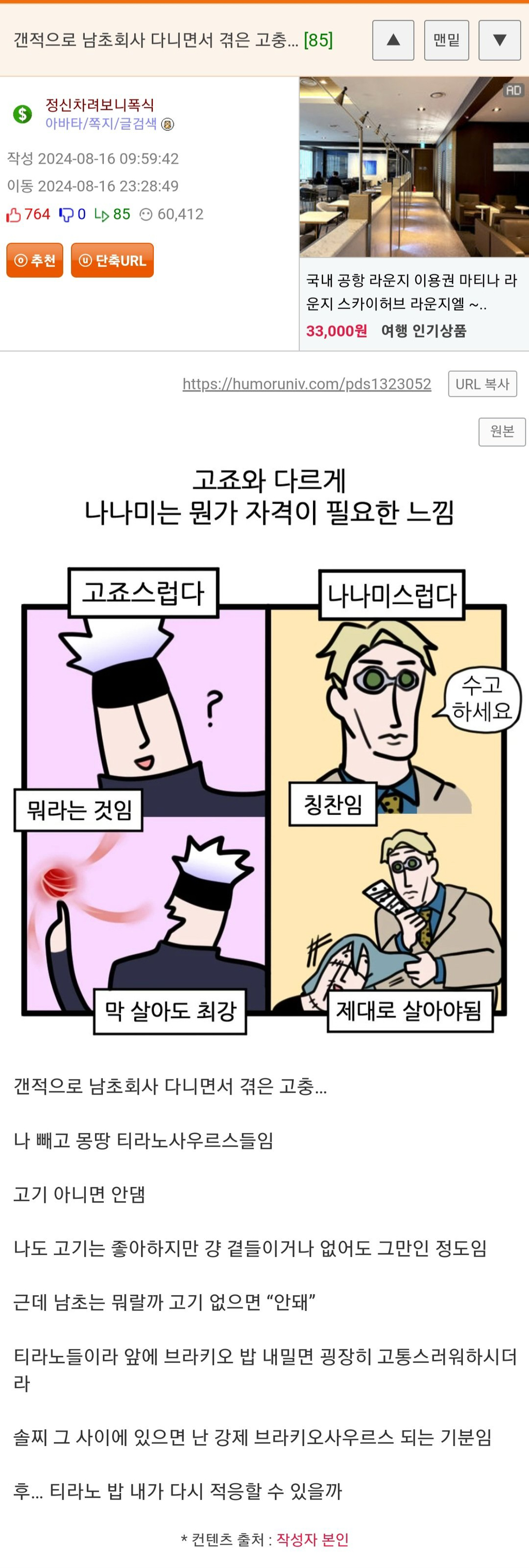 [[기타]]남초회사 다니면 겪는 고충.jpg 작성자이시연|작성시간24.11.25|조회수5,233 목록 댓글 15 글자크기 작게가 글자크기 크게가 다음검색 현재 게시글 추가 기능 열기 북마크 공유하기 신고 센터로 신고 댓글 댓글 15 댓글쓰기 답글쓰기 댓글 리스트 답댓글 작성자동물애호가 | 작성시간 24.11.25 상남자는 단백질 중요 답댓글 작성자우후르 | 작성시간 24.11.25 나쎄봐 인정... 맛잘알이시네 답댓글 작성자우후르 | 작성시간 24.11.25 동물애호가 헬창이신가요? 답댓글 작성자동물애호가 | 작성시간 24.11.25 우후르 아뇨 멸치입니다 쿄쿄 작성자오른손 | 작성시간 24.11.25 ? 고기나 생선같은 메인없이 밥을어키먹음??? 댓글 전체보기