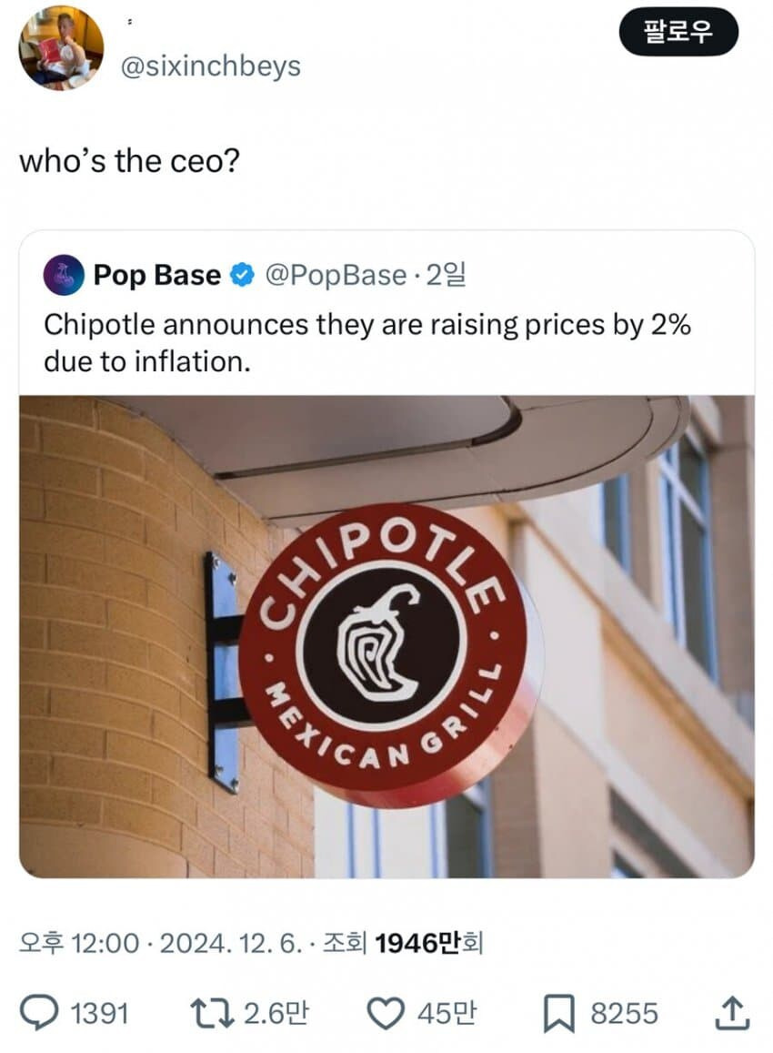 낙수효과가 발생 중인 미국 sns 상황 .jpg 작성자오늘은흐림|작성시간24.12.09|조회수7,561 목록 댓글 8 글자크기 작게가 글자크기 크게가 치폴레가 가격 올리겠다고 하니 달린 댓글ㅋㅋ "그짝 CEO는 누구십니까" 다음검색 현재 게시글 추가 기능 열기 북마크 공유하기 신고 센터로 신고 댓글 댓글 8 댓글쓰기 답글쓰기 댓글 리스트 작성자kgd6398 | 작성시간 24.12.09 gun법이 제일 쌔긴해 작성자24_efil | 작성시간 24.12.09 ㅋㅋㅋㅋ 작성자Meister | 작성시간 24.12.09 건법의.나라.ㄷㄷ 작성자내일은월요일 퉤 | 작성시간 24.12.09 ㅋㅋㅋㅋㅋㅋㅋㅋㅋㅋㅋㅋㅋㅋㅋㅋㅋㅋㅋㅋㅋㅋㅋㅋㅋㅋㅋ아 우리회사도 성과급 ㅈ같이 나왔는데음.... 작성자미르별 | 작성시간 24.12.09 ㄷㄷㄷㄷㄷㄷㄷㄷ 댓글 전체보기