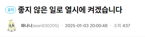 도탁스 (DOTAX) 갑자기 지각 공지 올렸는데 모두를 납득시킨 스트리머 와나나 .JPG 작성시간25.01.03|조회수22,232 목록 댓글 14 글자크기 작게가 글자크기 크게가 (끄덕...) 다음검색 현재 게시글 추가 기능 열기 북마크 공유하기 신고 센터로 신고 댓글 14 댓글 리스트 작성시간 25.01.03 와쟝 ㅠㅠ 작성시간 25.01.03 홀리 쉿... 작성시간 25.01.03 지게차랑 박았다네요... 답댓글 작성시간 25.01.03 와 저만하길 다행이네요 지게차랑 박으면 죽을수도있는디 작성시간 25.01.04 ㄷㄷ 카페 방문해 더 많은 댓글 만나기!