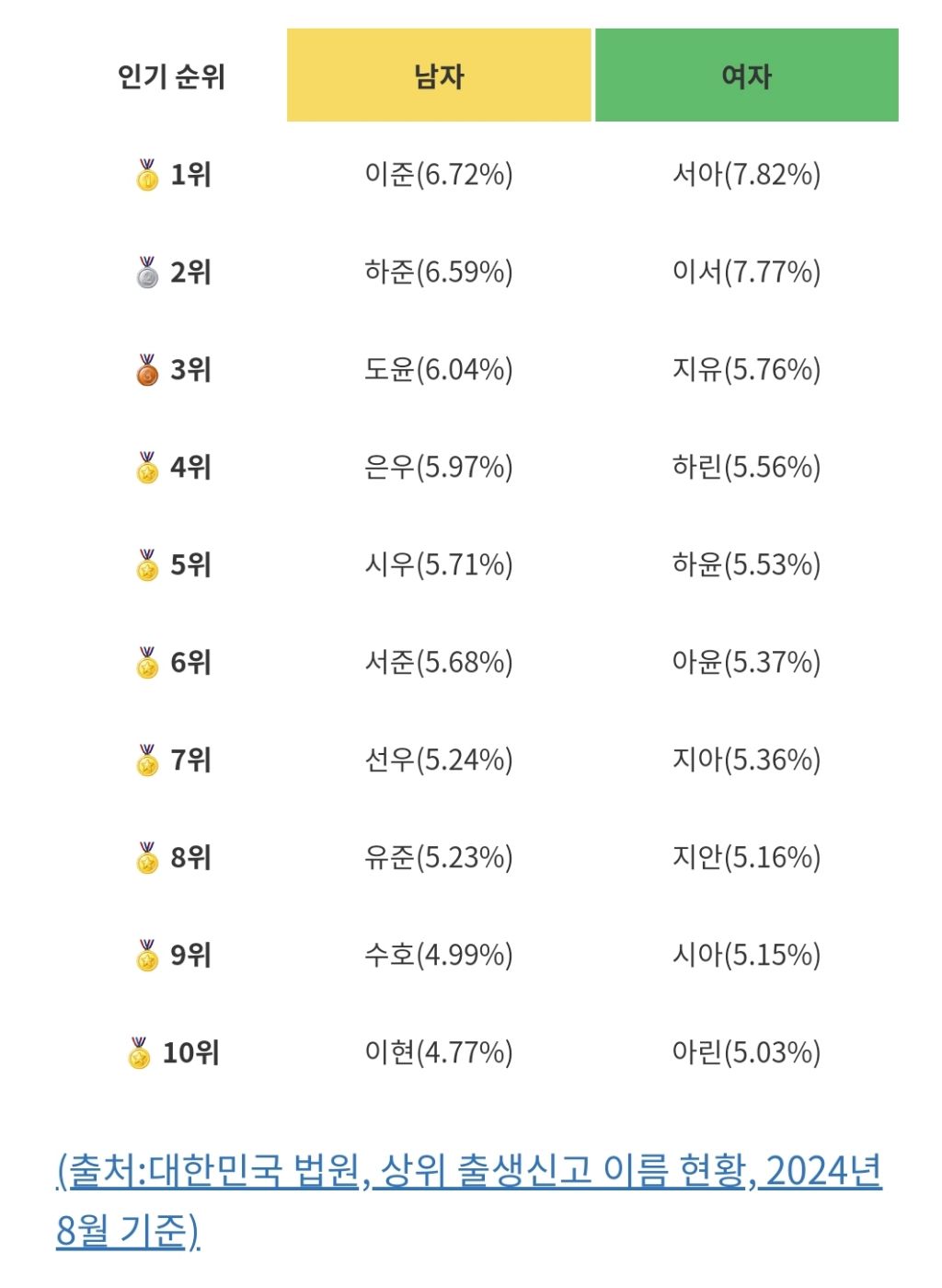 작성시간 25.01.05 와 엄청나네요 10위권까지 합하면 60프로정도가 된다는건데 상위 10개 이름이 60프로면 겹치는 이름이 엄청 많겠네요 ㄷㄷ