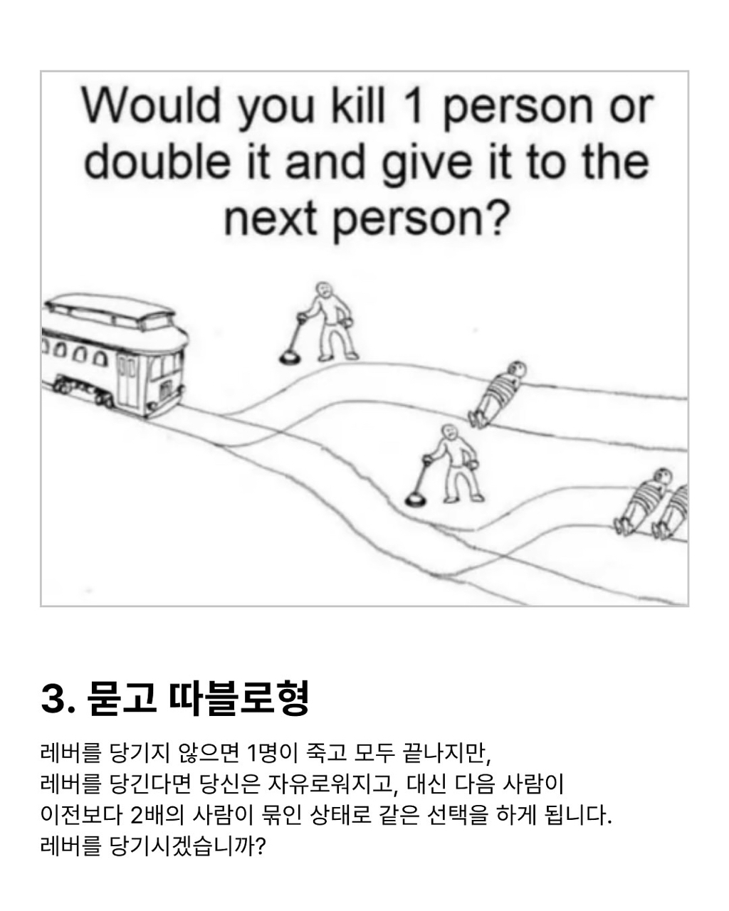 트롤리 딜레마 작성자본머스에게덜미잡힌맨유|작성시간25.02.02|조회수2,286 목록 댓글 1 글자크기 작게가 글자크기 크게가 다음검색 현재 게시글 추가 기능 열기 북마크 공유하기 신고 센터로 신고 댓글 댓글 1 댓글쓰기 답글쓰기 댓글 리스트 작성자달쏭이 | 작성시간 25.02.02 ㅋㅋㅋ 짬뽕 댓글 전체보기