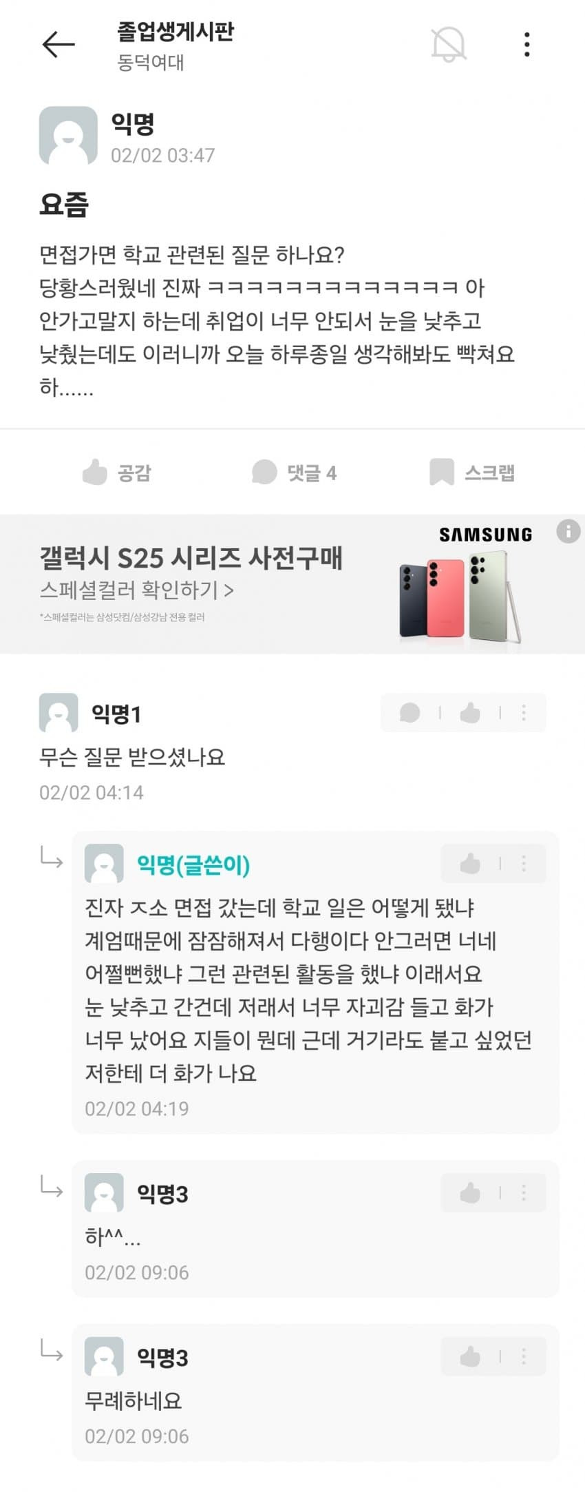 동덕여대생의 설연휴 작성자모든것을비운탁서|작성시간25.02.04|조회수7,045 목록 댓글 12 글자크기 작게가 글자크기 크게가 면접에서 업보빔 맞음 그 와중에 정신 못차리고 총장 고로시 다음검색 현재 게시글 추가 기능 열기 북마크 공유하기 신고 센터로 신고 댓글 댓글 12 댓글쓰기 답글쓰기 댓글 리스트 작성자믿음소망사랑중최고는망사 | 작성시간 25.02.04 눈 낮춰도 갈곳없다는거에 자괴감들었으면! 작성자브듬티시 | 작성시간 25.02.04 ㅋㅋㅋㅋㅋㅋㅋㅋㅋㅋㅋㅋㅋ 작성자오우야랑우탄 | 작성시간 25.02.04 총장 지각 이러고잇네 아침에 회의햇으면 어쩔라고 ㅋㅋㅋ 작성자후카가와 마이 | 작성시간 25.02.04 거기라도 가고 싶은 곳이면 눈 낮춘게 아니지 솜솜아ㅜㅜ 작성자DUCKCHUN | 작성시간 25.02.05 으이그다 정말.... 댓글 전체보기