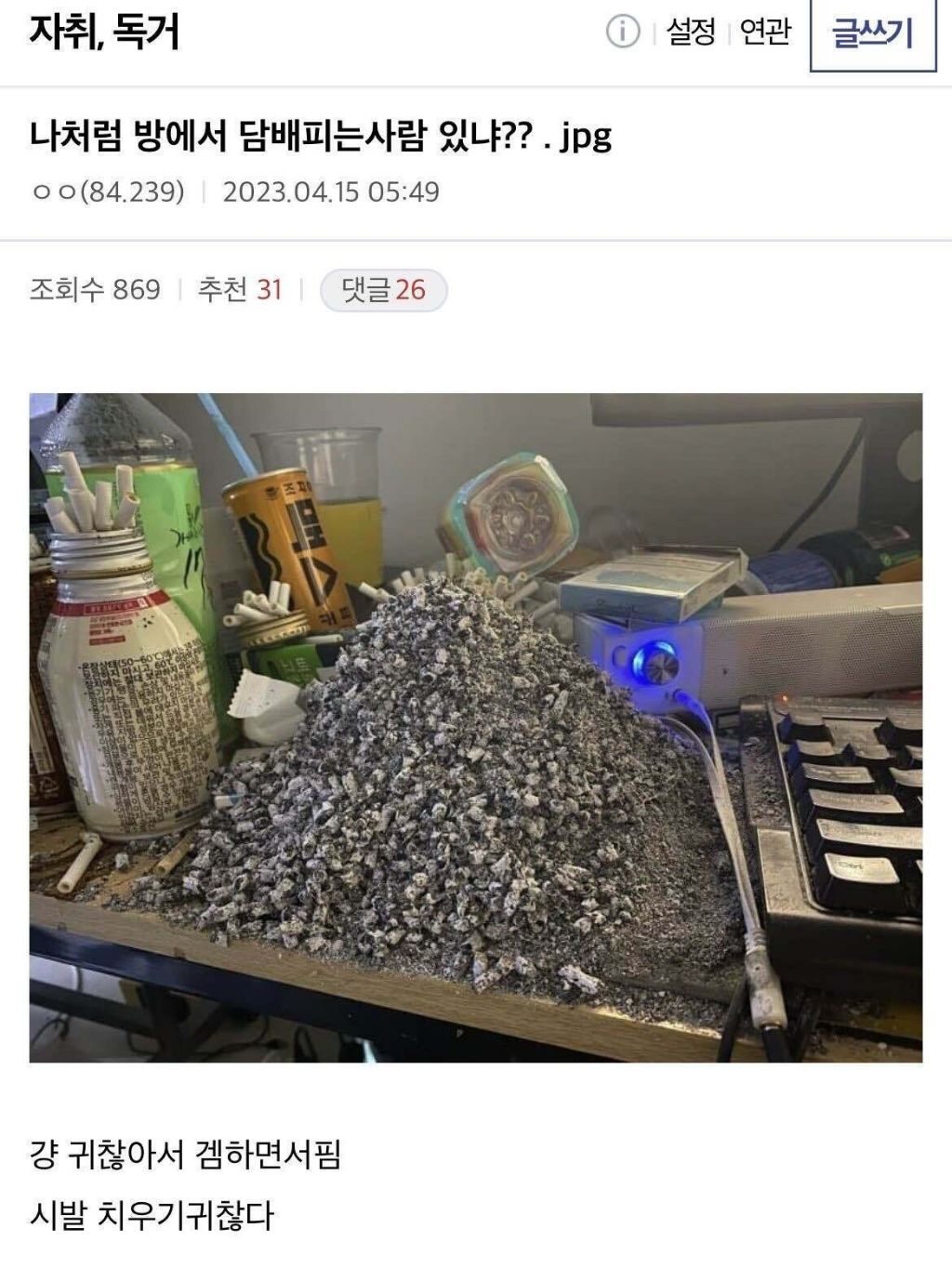 제일 이해 안가는 흡연충 유형 작성자길가다나무를주우면우드득|작성시간25.02.08|조회수7,876 목록 댓글 23 글자크기 작게가 글자크기 크게가 집안에서 담배피기 다음검색 현재 게시글 추가 기능 열기 북마크 공유하기 신고 센터로 신고 댓글 댓글 23 댓글쓰기 답글쓰기 댓글 리스트 작성자바다는하늘 | 작성시간 25.02.08 나두 20년전에늨 방에 재떨이 만들어 두고.피긴했는데 짤은 좀 심하구만 작성자순규써니 | 작성시간 25.02.08 저런건 흡연자도 거름.... 작성자루크쇼우 | 작성시간 25.02.08 저건어뜨케치우냐... 작성자서자자동차 | 작성시간 25.02.08 옛날엔 다 집에서 피웠지 작성자퍼리 | 작성시간 25.02.08 저게 짐승이지 뭔;;; 댓글 전체보기