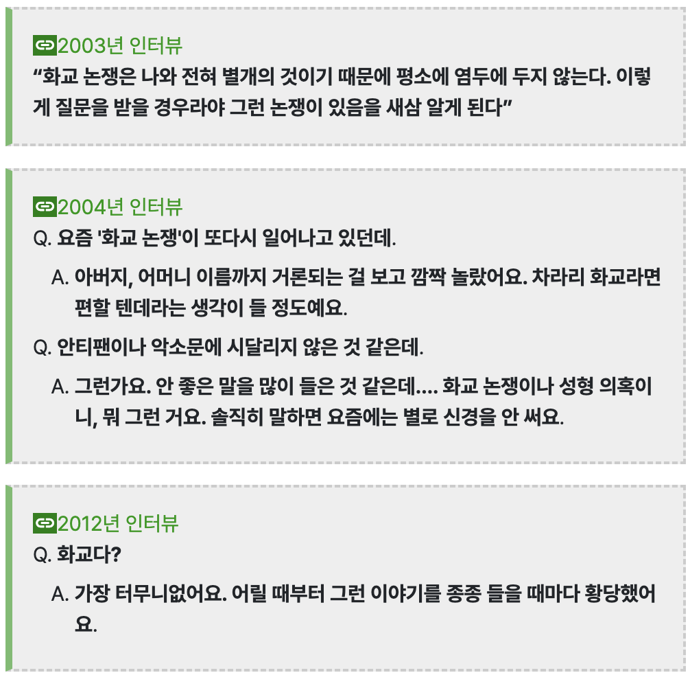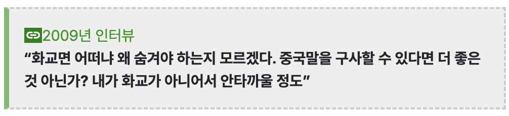 부모중 하나도 아닌 둘 다 한국사람 귀에 생소하게 들리는 성씨를 갖고 있다는 사실이 넷상에 퍼지며 화교라는 루머가 기정사실화돼버림
