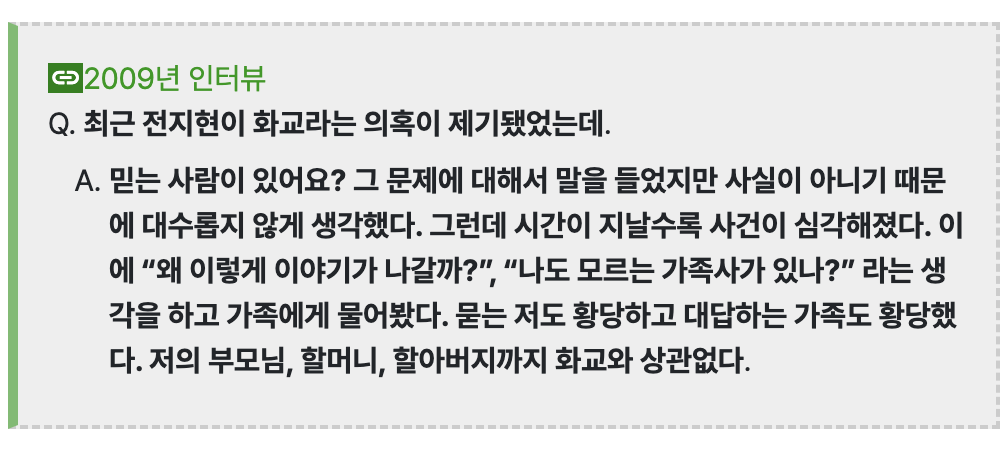데뷔초부터 전지현측은 한결같이 부정했었지만 한참 화교논란 불탈 당시 여론은 믿어줄 생각이 아예 없는 수준
